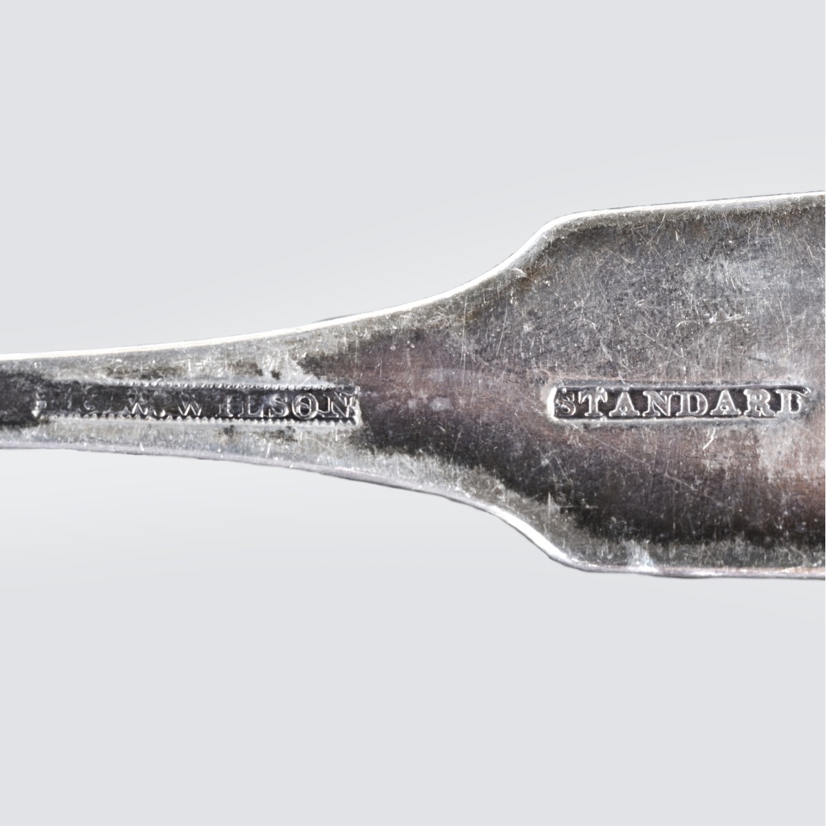Five (5) 19th Century American Coin Silver Spoons. Stamped Butler & McCarty STANDARD. Each measures 9". Approx. weight 11.57 troy ounces. Condition: Typical dents and dings, monogrammed. Estimate: $50.00 - $100.00 Domestic Shipping: $30.00