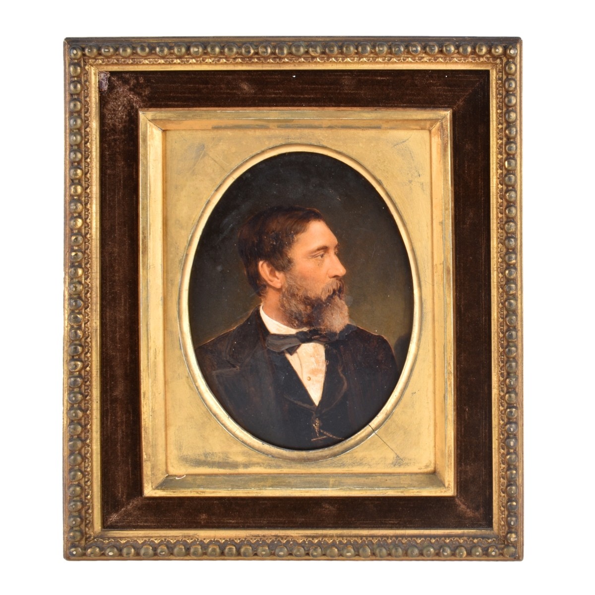 Antique miniature oil on paper "Portrait of a Man". Unsigned. Measures 7-3/4" x 5-3/4", frame measures 12" x 10". Condition: Surface stains. Estimate: $100.00 - $150.00 Domestic Shipping: $68.00