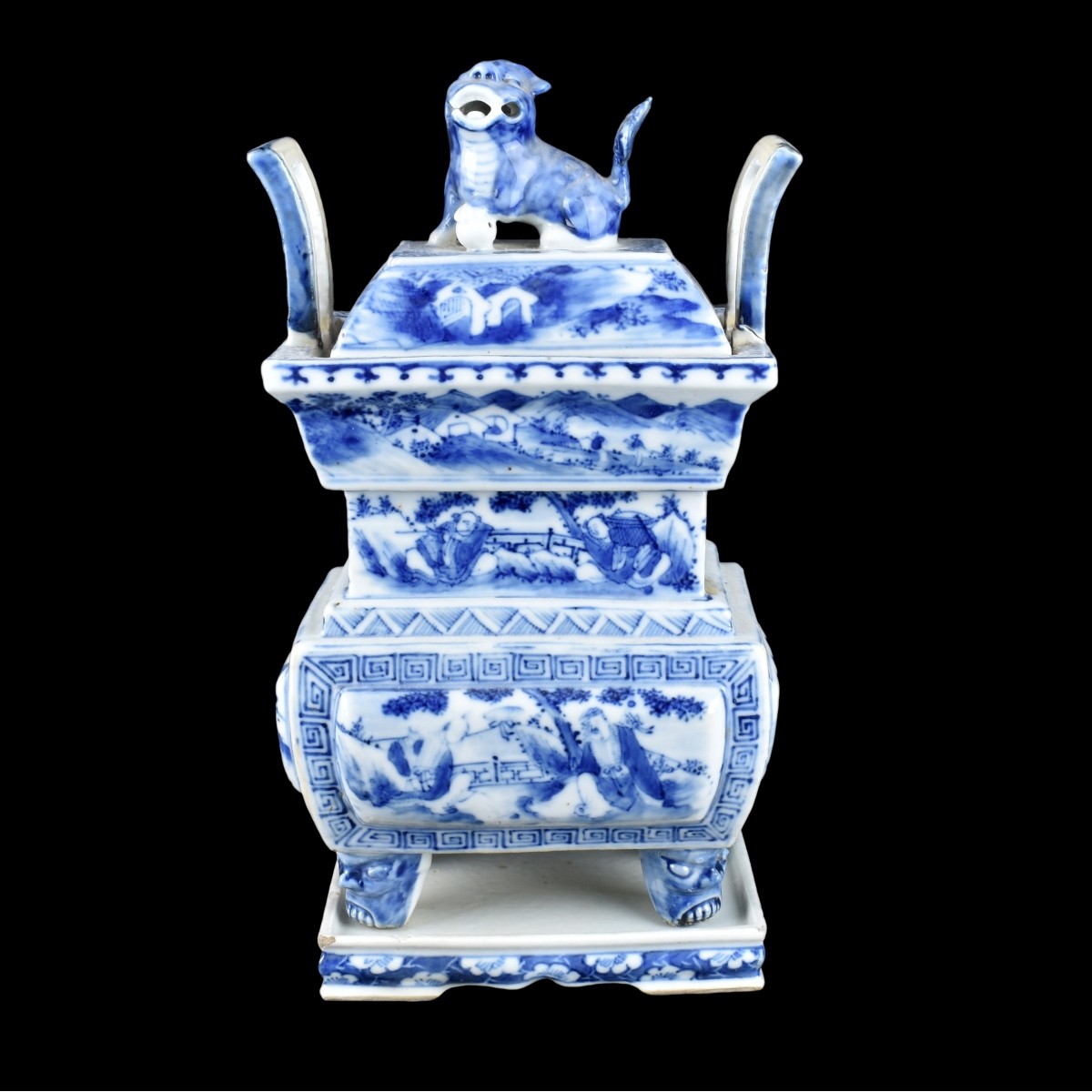 Early 20th Century Chinese Blue and White Porcelain Incense Burner and Under Tray. Unsigned. Foo dog finial. Measures 11" H x 5-3/4" W (w/under tray). Condition: One handle has been restored Estimate: $150.00 - $250.00 Domestic Shipping: $66.00