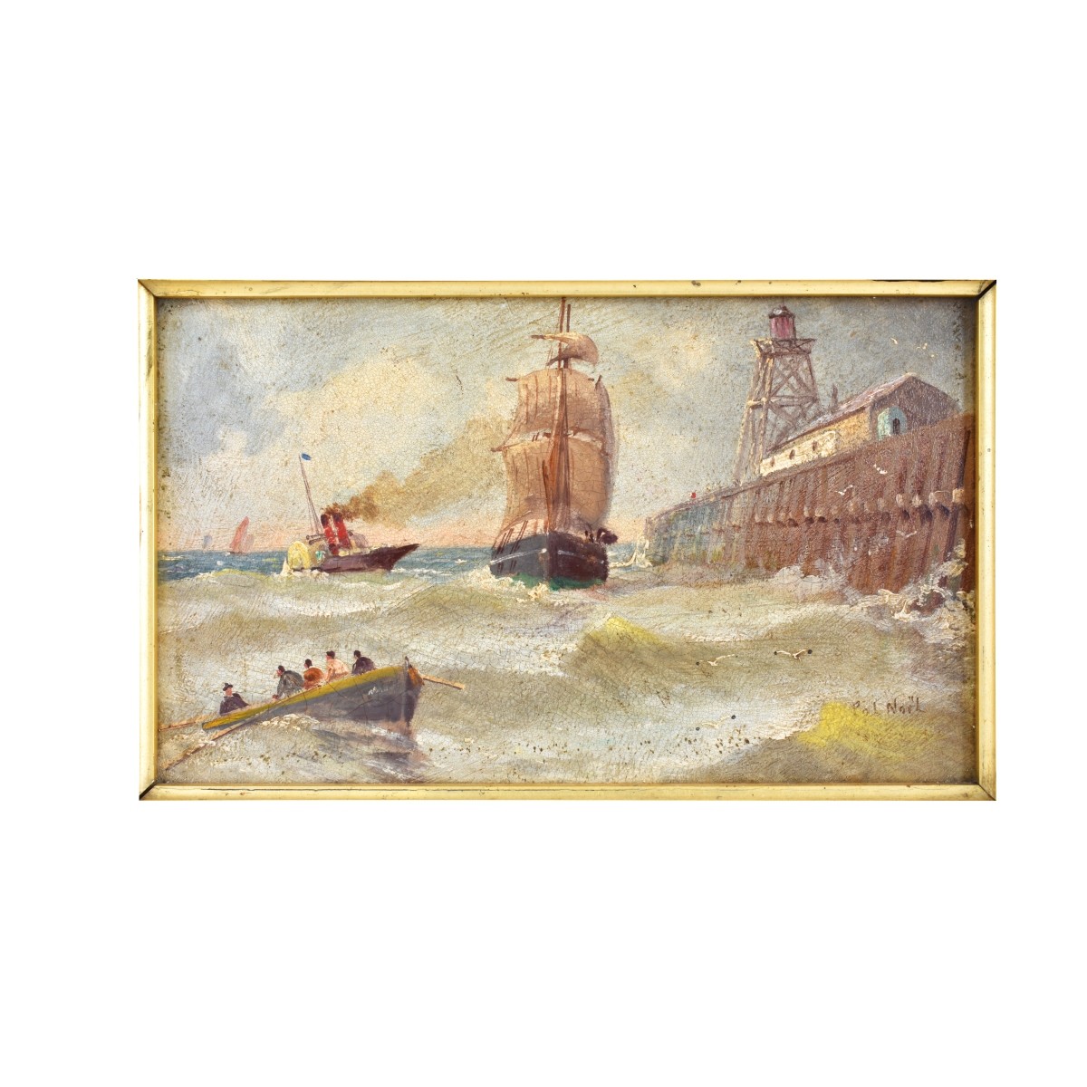 Pol Noel, French (19th/20th C.) Two Oil on Panels, Boat Scenes with Figures, Signed Lower Right. Sights measure 5-1/4 x 8-3/4, frame 8-5/8" H x 12" W. Condition: Craquelure, some yellowing Estimate: $150.00 - $250.00 Domestic Shipping: $95.00