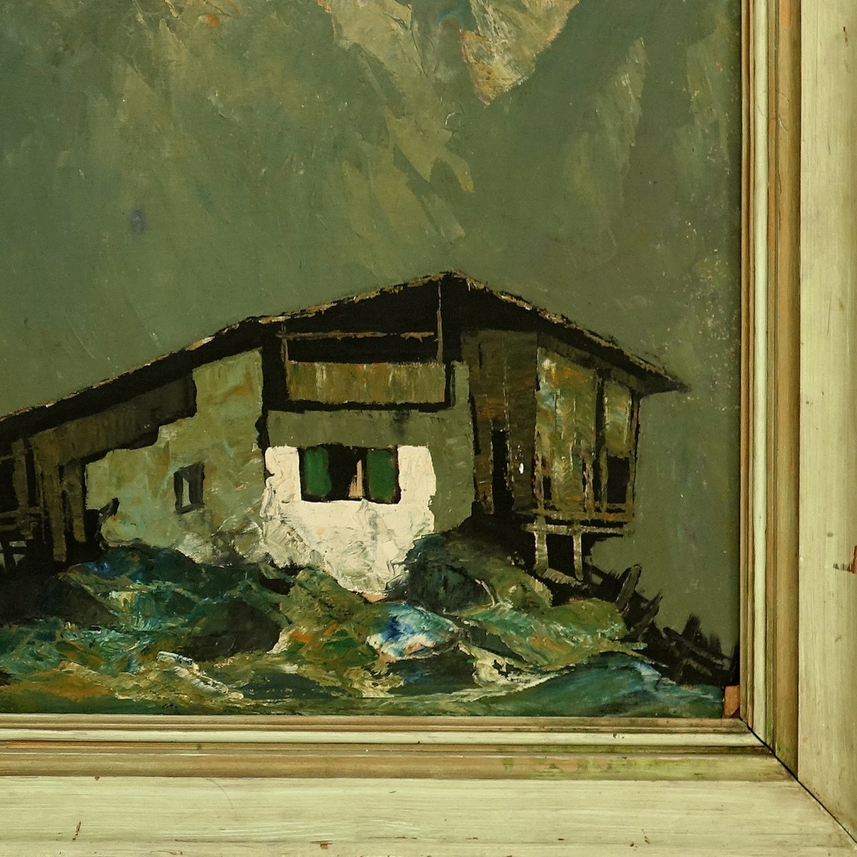 20th Century Oil On Masonite "Mountain Outlook". Signed Holman lower left. Measures 27-3/4" x 32", frame measures 33-3/4" x 38-3/4". Estimate: $50.00 - $100.00 Domestic Shipping: Third party