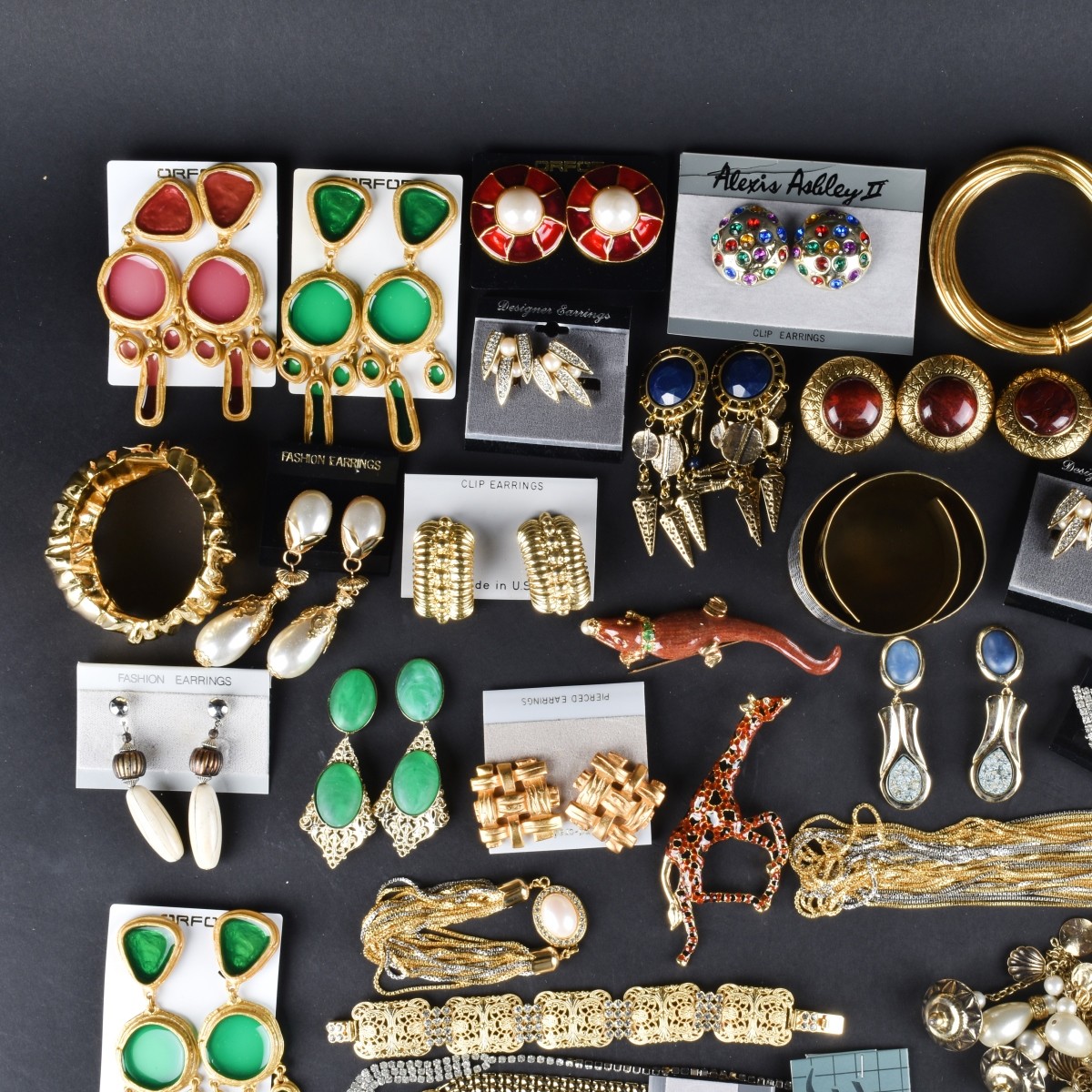 Large Collection of Retro Costume Jewelry. Includes: necklaces, earrings, pin and bracelets. Mostly bejeweled or with rhinestones decor (no gold or silver). Condition: New unused condition Estimate: $50.00 - $150.00 Domestic Shipping: $58.00