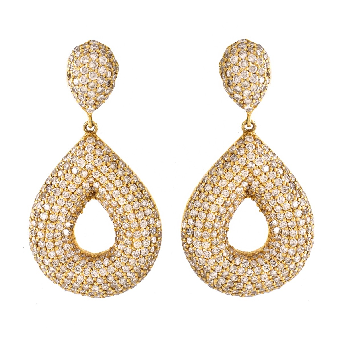 Pave Set Round Brilliant Cut Diamond and 14 Karat Yellow Gold Pendant Earrings. Unsigned. Measure 1-5/8" L, 7/8" W. Approx. weight: 23.0 grams. Condition: Very good condition. Estimate: $5000.00 - $7000.00 Domestic Shipping: $30.00