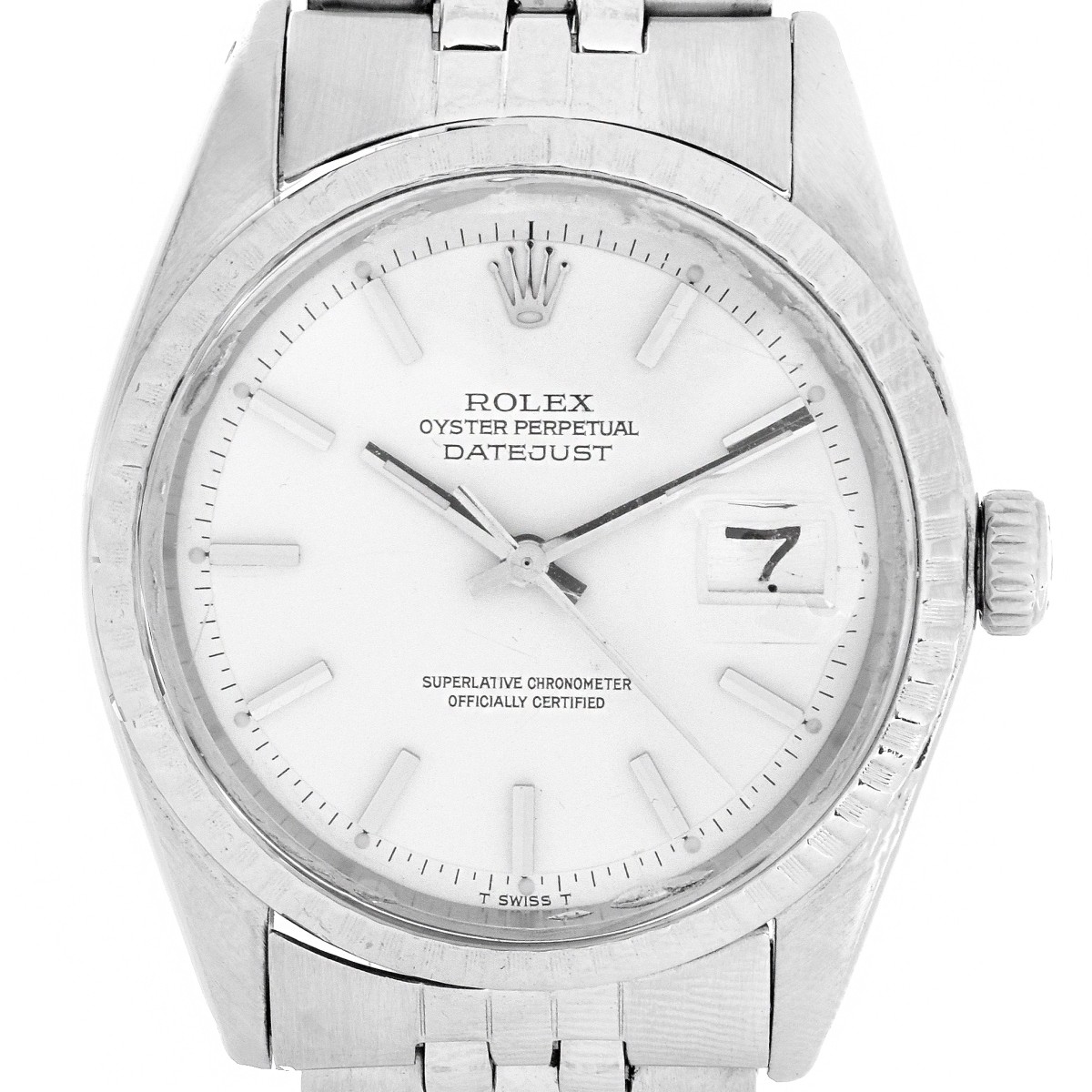 Man's Vintage Rolex Datejust Stainless Steel Bracelet Watch, White Dial. Case measures 36mm. Bracelet measures 7-3/4" L. Condition: Overall good vintage condition. Slight surface wear, scratches. Bracelet stretched. Running. Please note the gallery does not warranty the running condition of watches. No box, no papers. Estimate: $3000.00 - $4000.00 Domestic Shipping: $32.00
