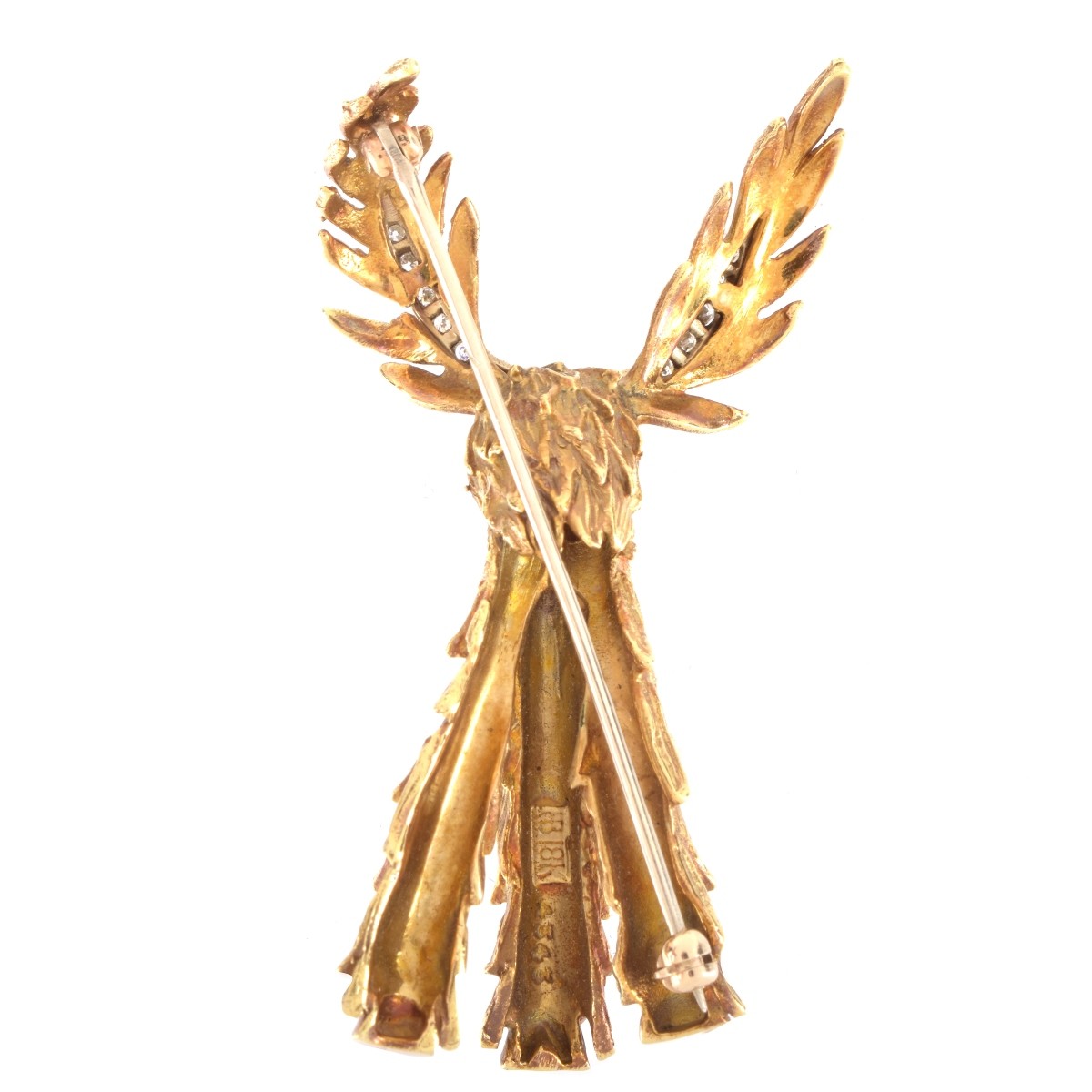 Vintage 18 Karat Yellow Gold Figural Deer Brooch accented throughout with small Diamonds and .50 Carat Rubies. Stamped 18K. Measures 2-1/4" H, 1-1/8" W. Approx. weight: 20.7 grams. Condition: Very good vintage condition. Estimate: $900.00 - $1200.00 Domestic Shipping: $28.00