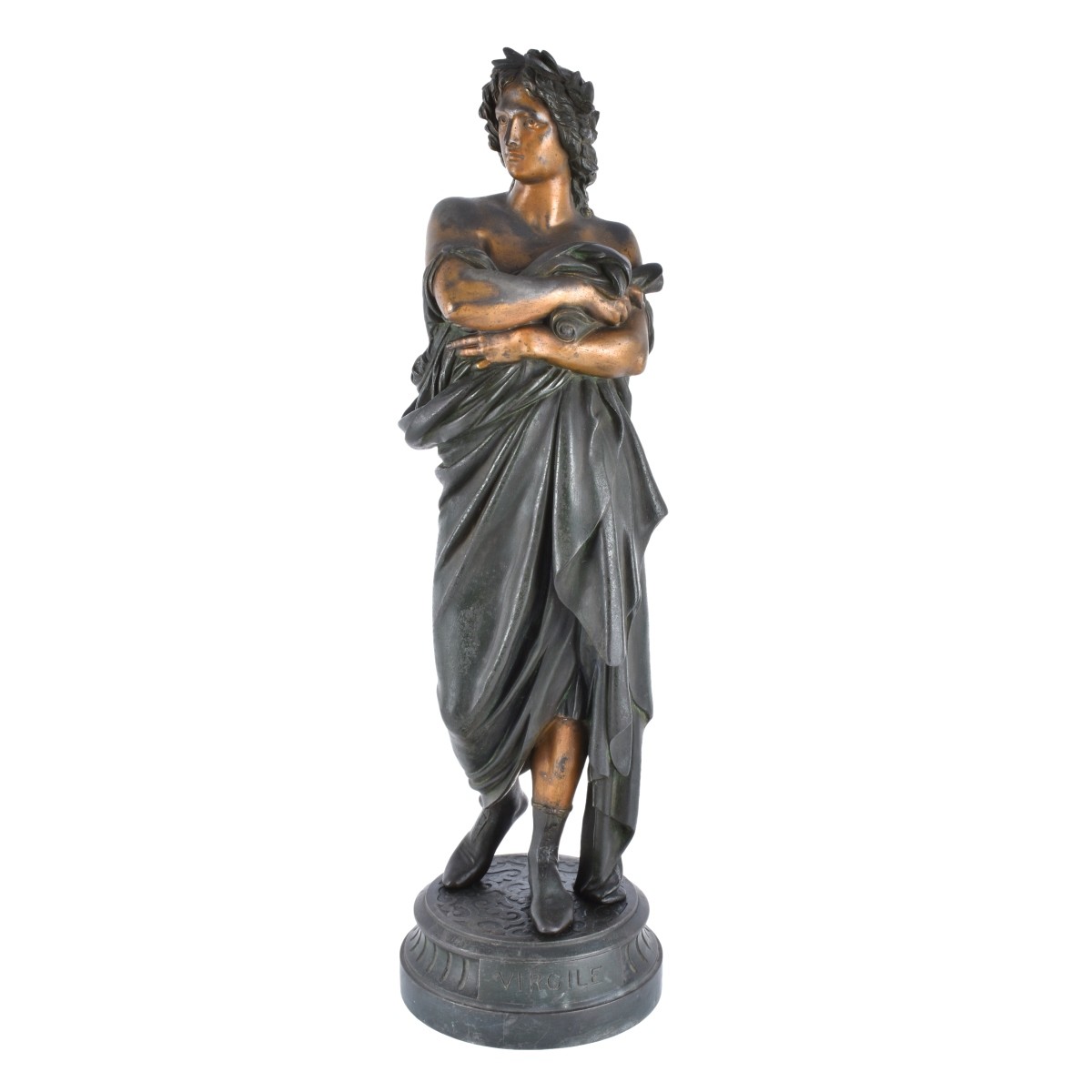 Large French Metal Sculpture "Vergile" Unmarked. Measures 23-1/4" H x 5-1/2" W. Condition: Rubbing, stress crack lower otherwise good condition Estimate: $150.00 - $250.00 Domestic Shipping: Third party