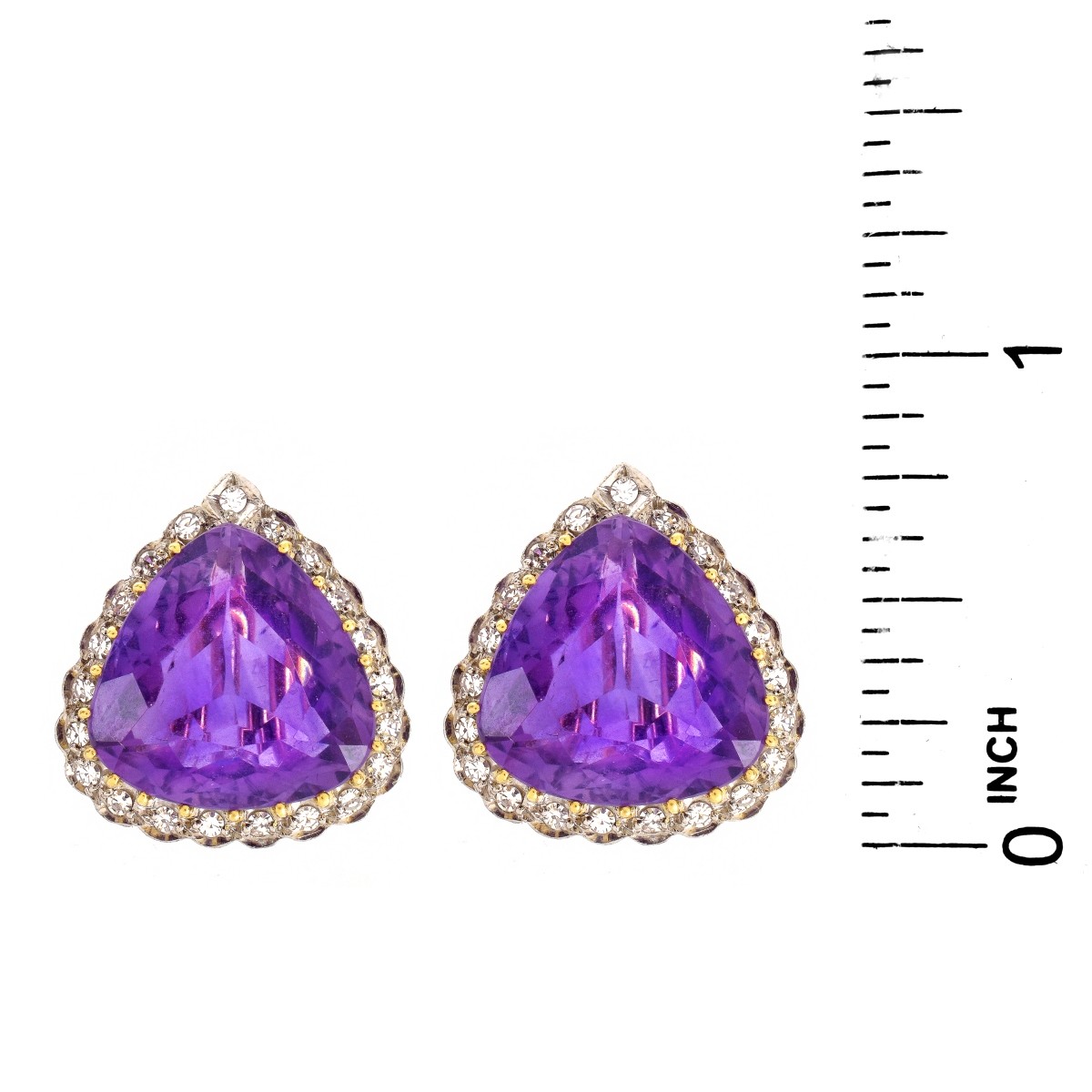 Vintage H Stern Triangular Cut Amethyst, Round Cut Diamond and 18 Karat Yellow Gold Earrings. Signed (logo) and stamped 750. Measure 33/4" x 3/4". Approx. weight: Condition: Very good condition. Estimate: $800.00 - $1000.00 Domestic Shipping: $30.00