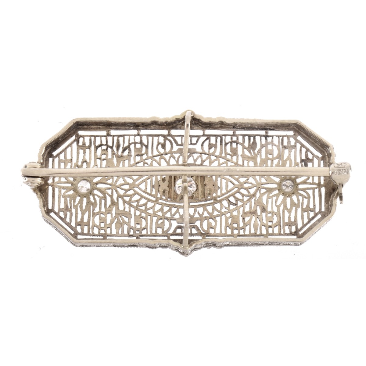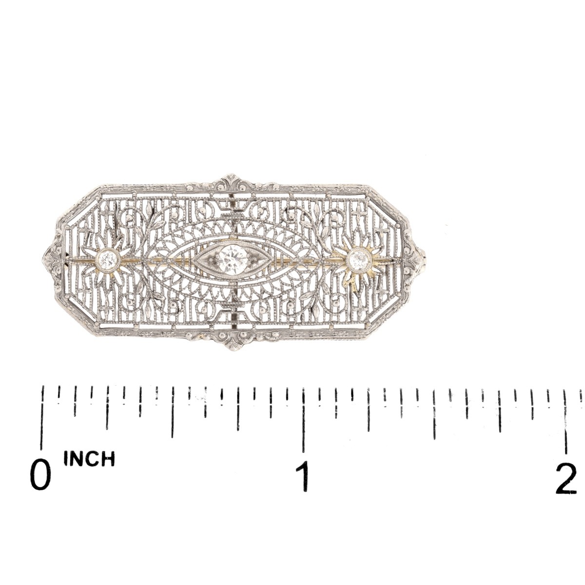 Antique Approx. .20 Carat TW Old European Cut Diamond and Filigree 14 Karat White Gold Brooch / Pendant. Measures 5/8" H, 1-1/2" W. Approx. weight: 3.8 grams. Condition: Very good condition. Estimate: $250.00 - $350.00 Domestic Shipping: $28.00
