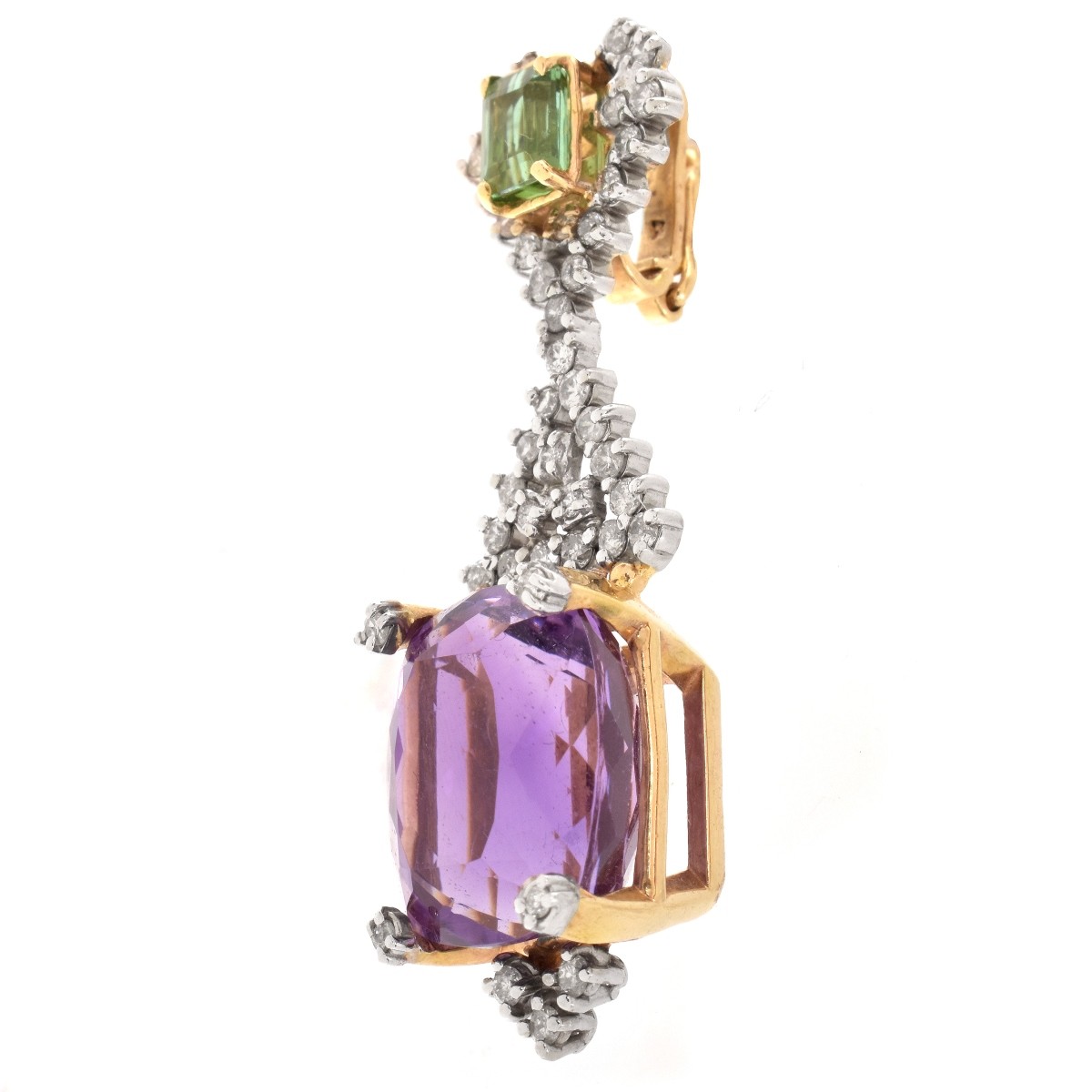 Vintage Round Brilliant Cut Diamond, Oval Cut Amethyst, Tourmaline and 14 Karat Yellow and White Gold Pendant. Amethyst measures 16mm x 13mm. Pendant measures 1-7/8" L, 1/2" W. Approx. weight: 11.2 grams. Condition: Very good vintage condition. Estimate: $500.00 - $700.00 Domestic Shipping: $30.00