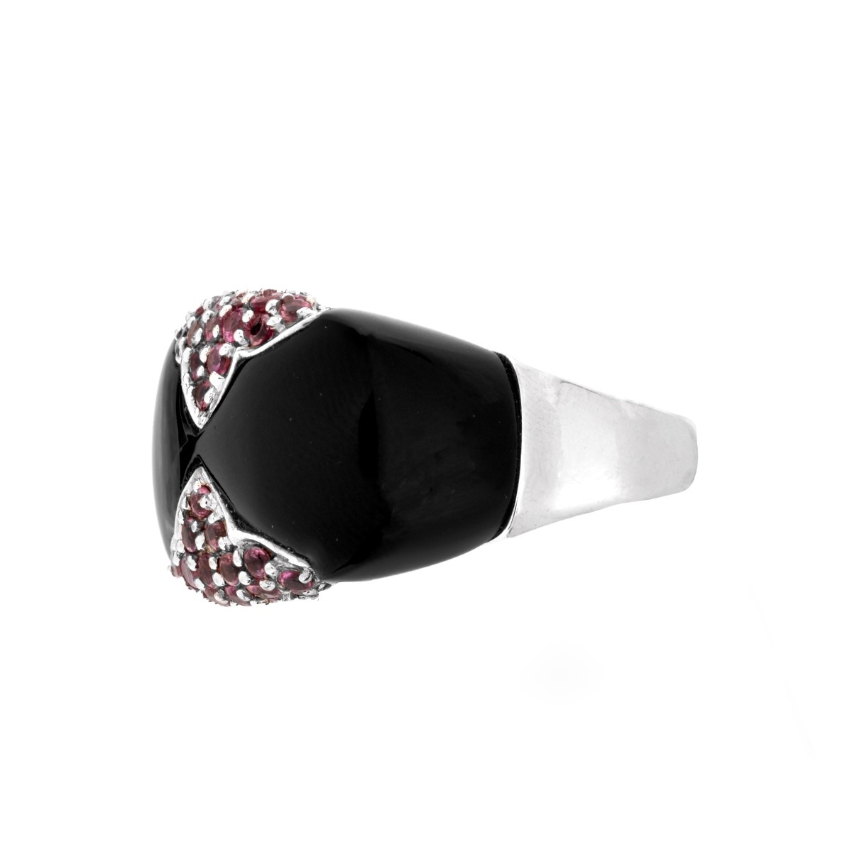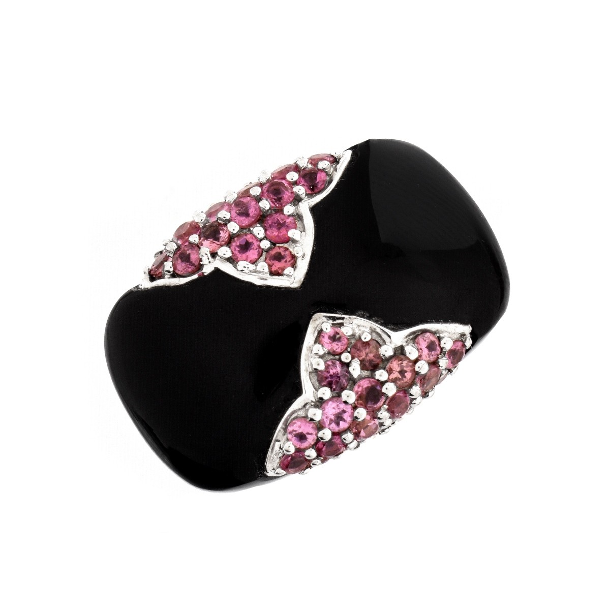 Pave Set Round Brilliant Cut Pink Sapphire, Black Onyx and 14 Karat White Gold Ring. Stamped 14K. Ring size 7. Approx. weight: 15.2 grams. Condition: Very good condition. Estimate: $600.00 - $800.00 Domestic Shipping: $28.00