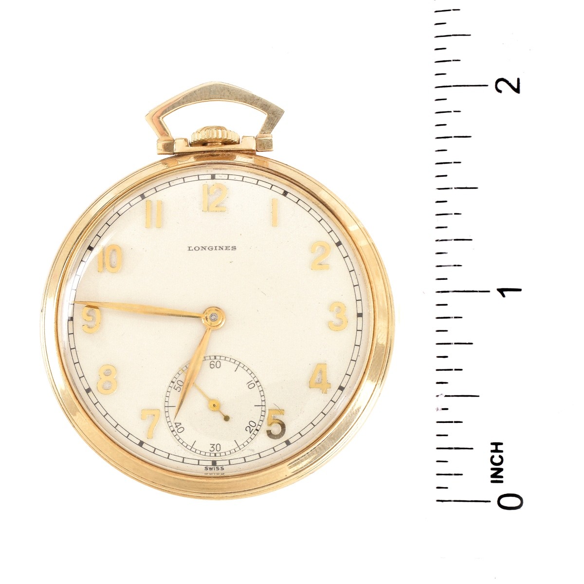 Vintage Circa 1938 Longines 14 Karat Yellow Gold Seventeen Jewel Pocket Watch with Box. Numbered 93703, stamped 14K. Case measures 43mm. Approx. weight: 47.6 grams. Condition: Very good condition. Running. Engraved monogram to case back, inscribed and dated to interior case back. Please note the gallery does not warranty the running condition of watches. Estimate: $500.00 - $700.00 Domestic Shipping: $34.00