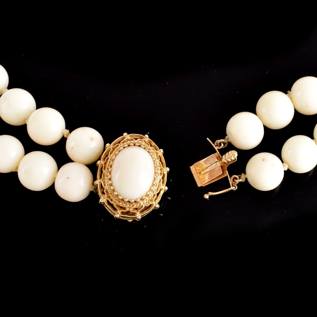 Vintage 11.0-11.5mm Angel Skin Coral Bead Two Strand Necklace with 14 Karat Yellow Gold Clasp. Stamped 14K. Measures 36" L. Approx. weight: 288.4 grams. Condition: Very good vintage condition. Estimate: $300.00 - $500.00 Domestic Shipping: $34.00