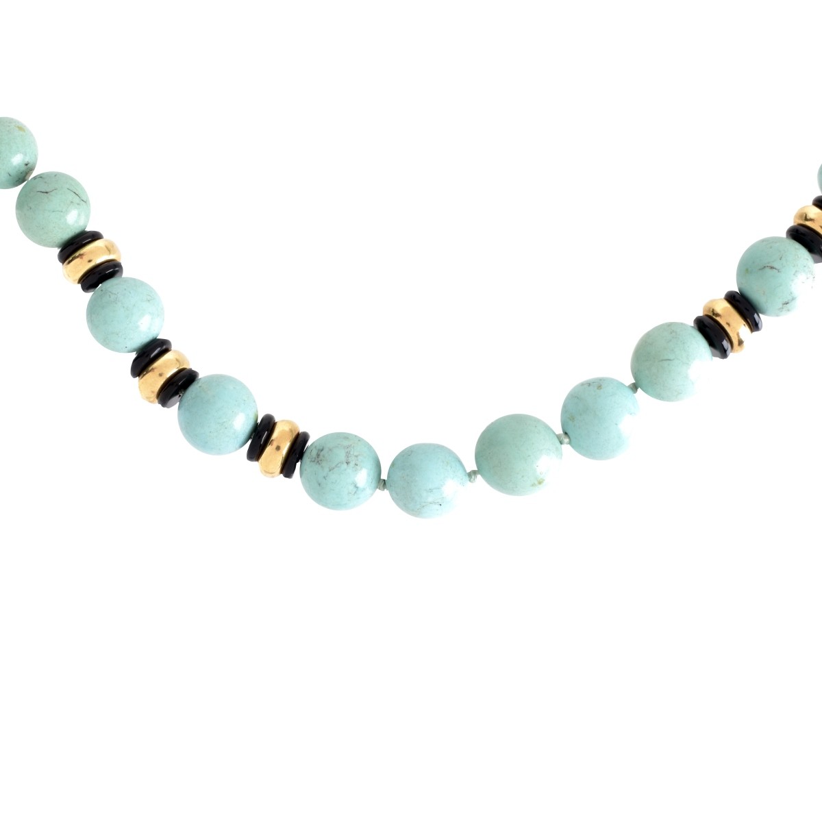 Vintage 9.3-13.50mm Turquoise Bead and Black Onyx Necklace with Silver Clasp. Clasp stamped silver. Measures 26" L. Approx. weight: 86.5 grams. Condition: Very good vintage condition. Estimate: $50.00 - $100.00 Domestic Shipping: $30.00