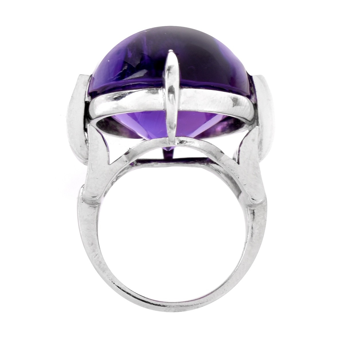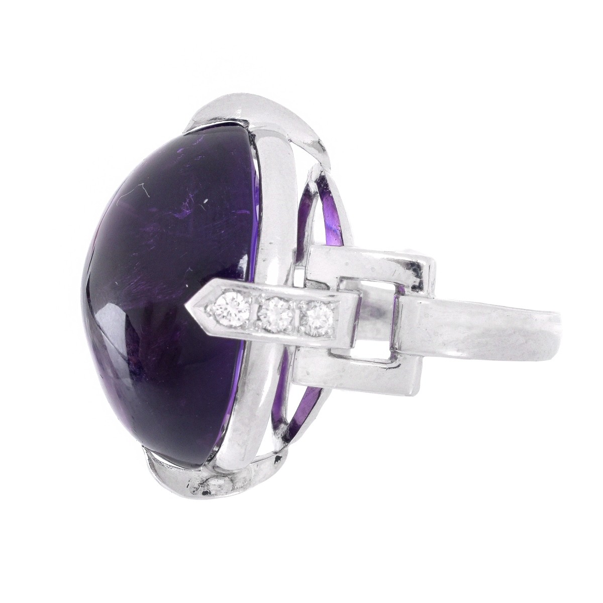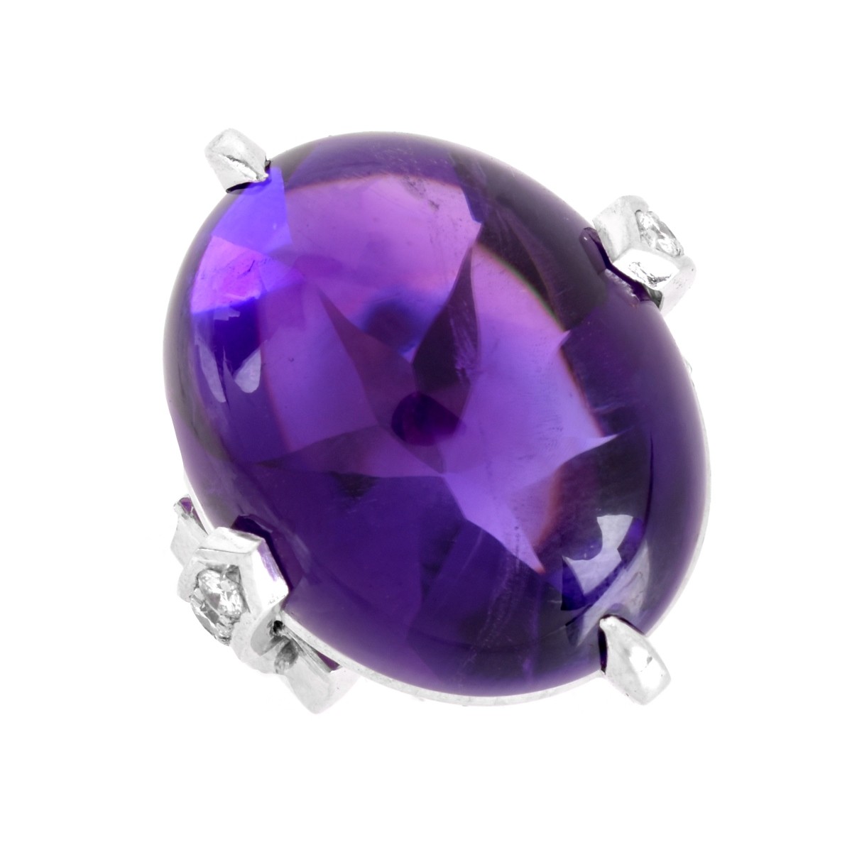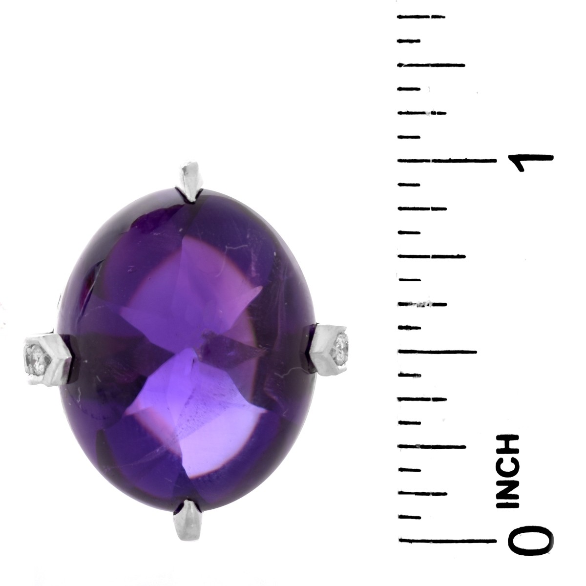 Vintage Christian Dior Large Cabochon Amethyst, .21 Carat Round Brilliant Cut Diamond and Platinum Ring. Amethyst measures 21mm x 17.5mm. Signed, stamped Pt900. Ring size 4-3/4. Approx. weight: 19.2 grams. Condition: Very good vintage condition. Estimate: $3000.00 - $4000.00 Domestic Shipping: $28.00