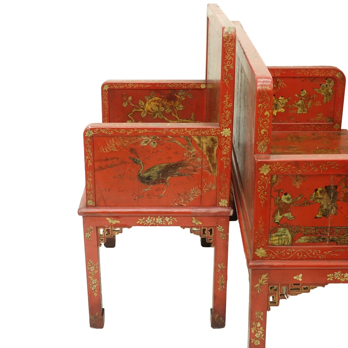 Three (3) Piece 19th Century Chinese Lacquer Seating Group. The set is comprised of 2 arm chairs and a settee, decorated in parcel gilt and red lacquer. It features multiple scenes of mountain village, birds, flowers etc. Unsigned. Settee measures 34" H x 44" W x 21" D, the chairs 37-1/2" H x 23" W x 18" D. Condition: Wear, craquelure, rubbing, losses. Estimate: $600.00 - $800.00 Domestic Shipping: Third party