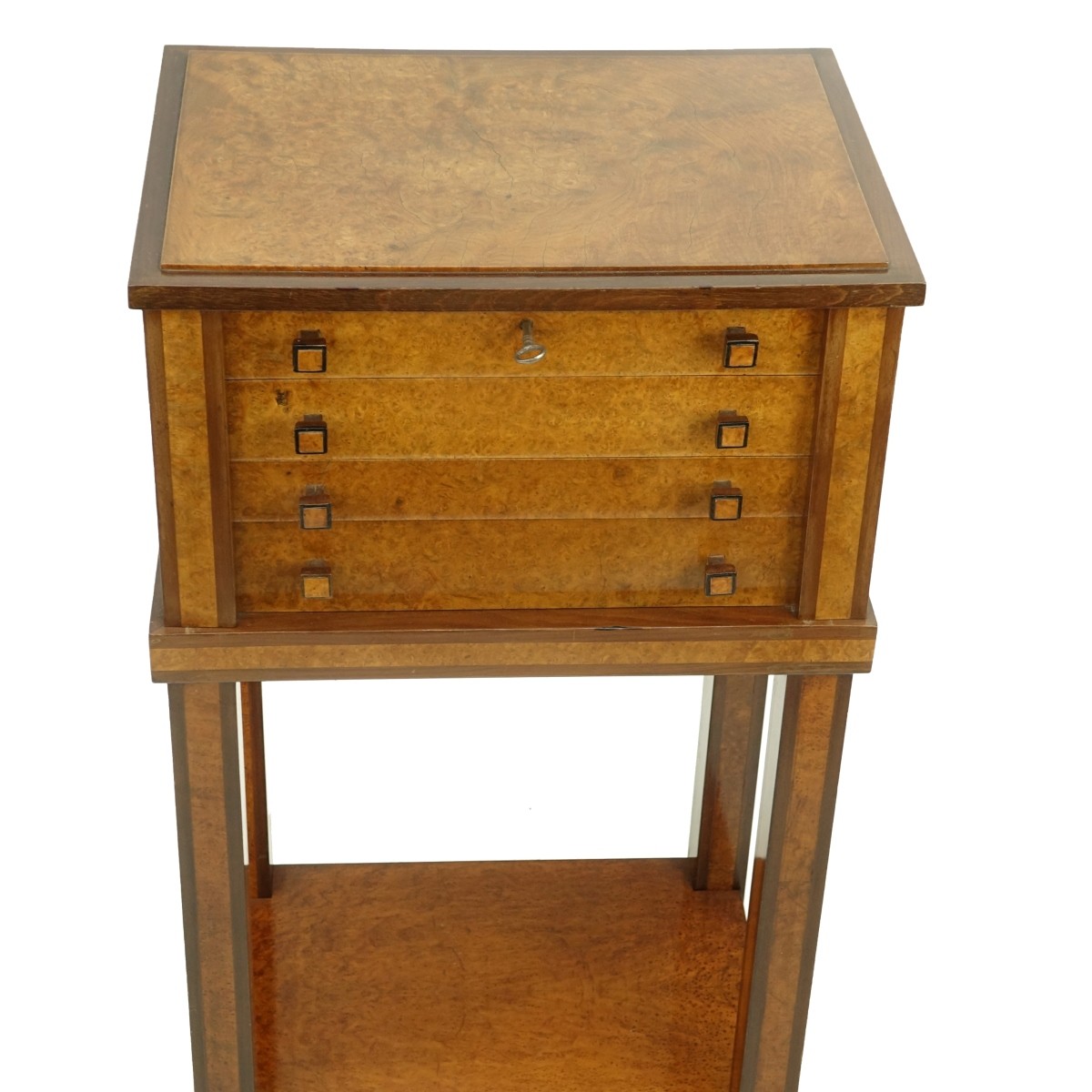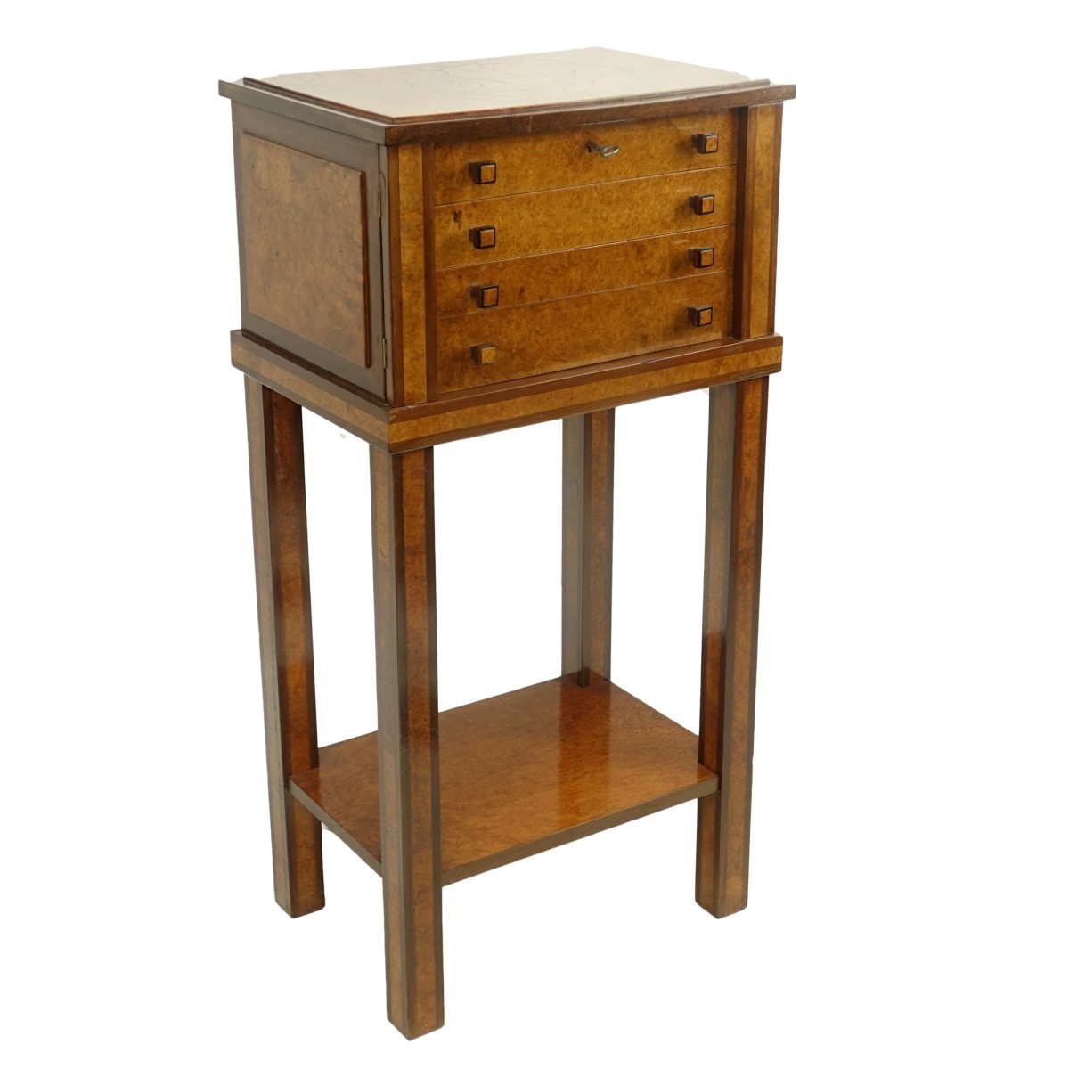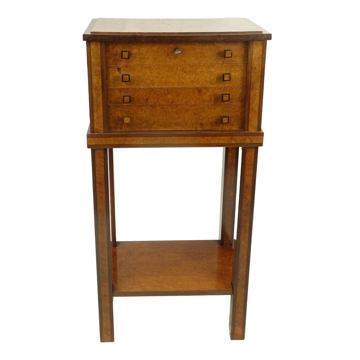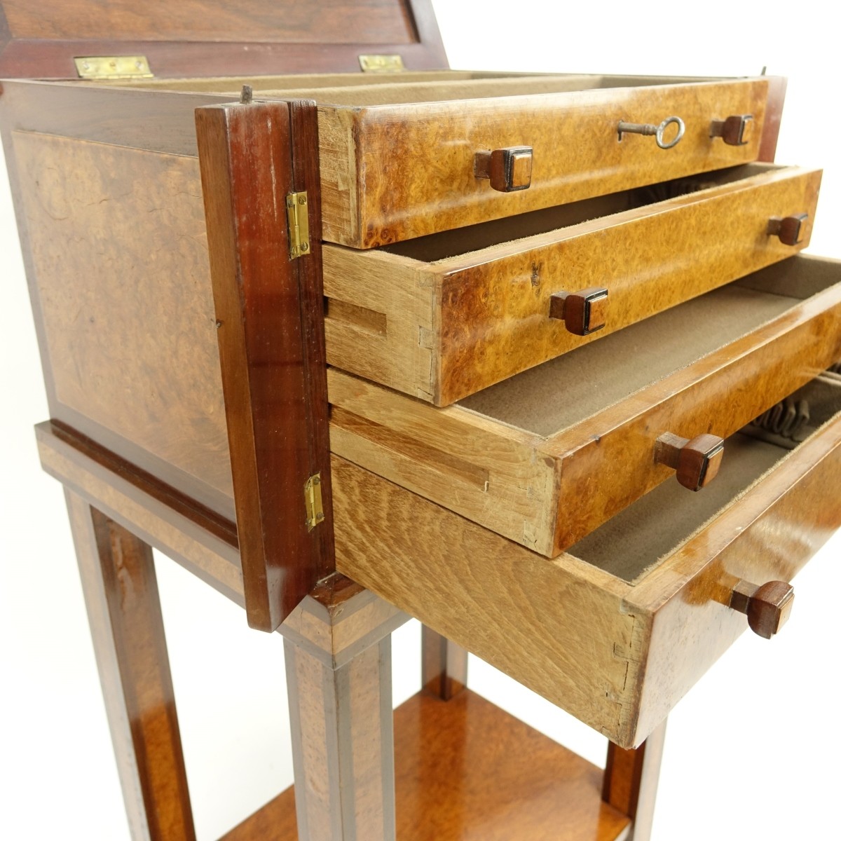 Art Deco Standing Silver Chest. The chest of mahogany and burl wood. Top opening with 3 drawers, all custom fitted. Key included. Unsigned. Measures 40-1/2" H x 20" W x 14-1/4". Condition: Light wear from age and use, overall very good condition. Estimate: $300.00 - $500.00 Domestic Shipping: Third party
