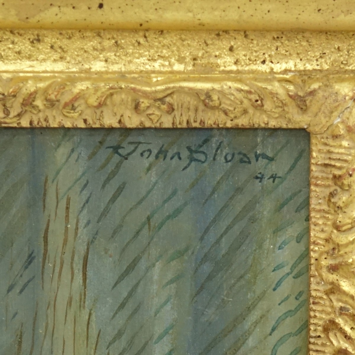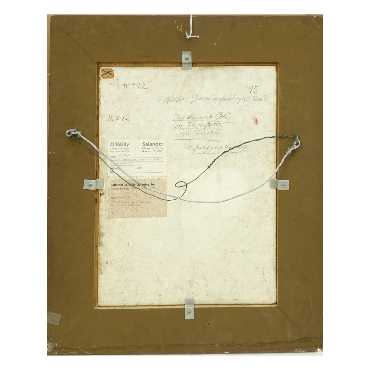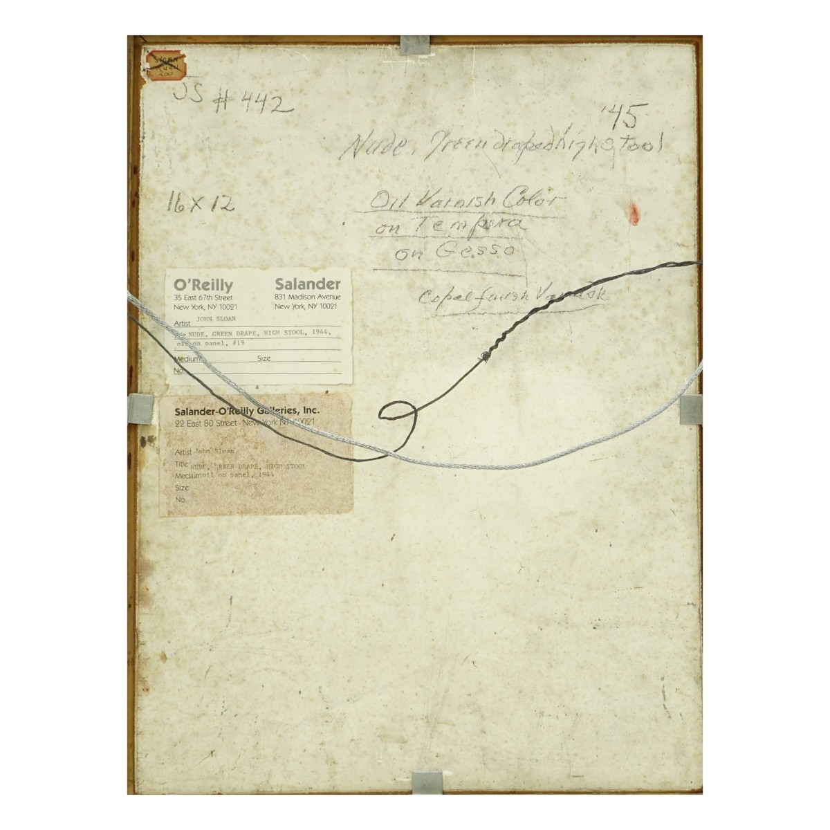 John French Sloan, American (1871-1951) Oil on masonite "Nude, Green Drape, High Stool" . Signed and dated '44 upper right, inscribed, gallery labels verso. Measures 16" x 12", frame measures 22-1/4" x 18-1/4". Condition: Good condition. Estimate: $6000.00 - $8000.00 Domestic Shipping: $145.00