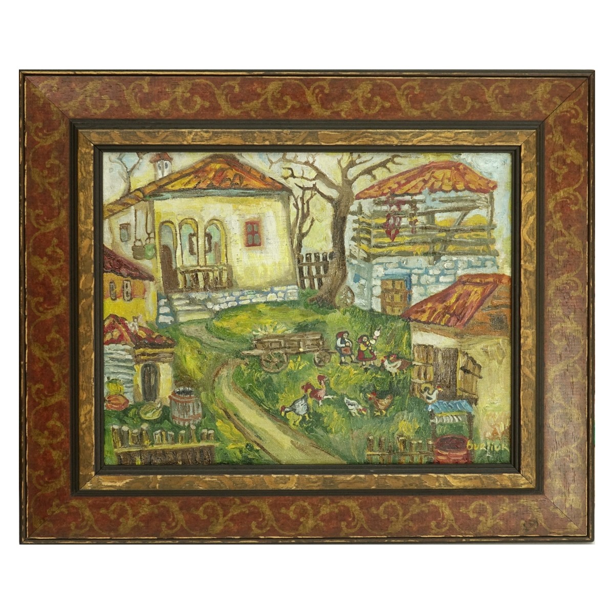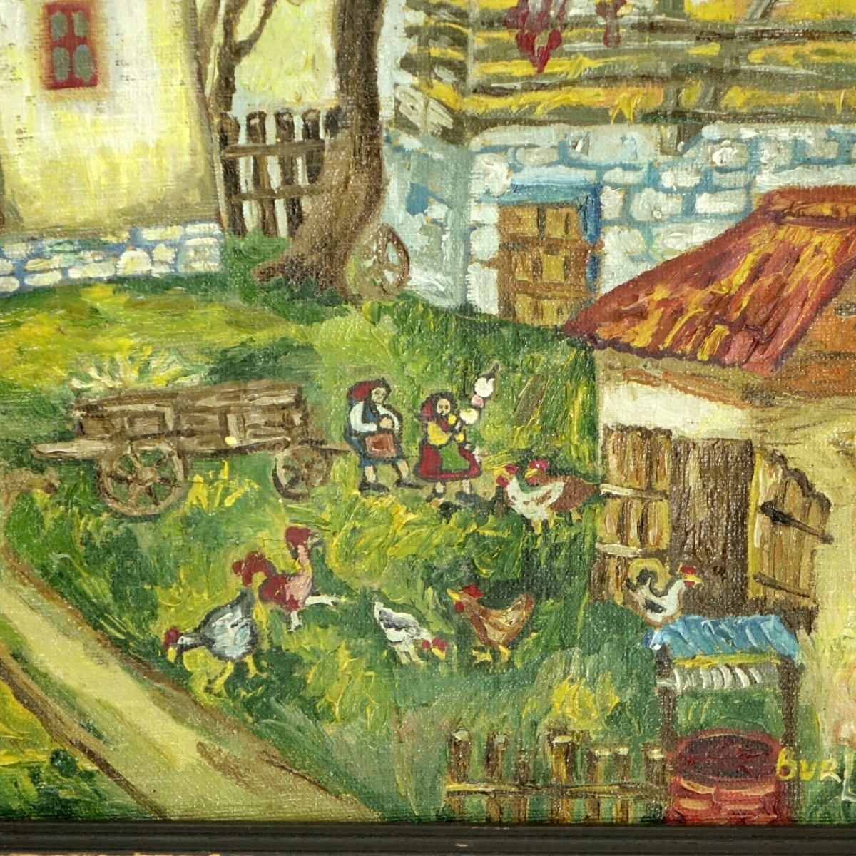 After: David Davidovich Burliuk Russian/American (1882-1967) Oil on Canvas, Village Scene, Signed Lower Right. Label attached en verso. Measures 9-5/8" H x 12" W, frame measures 14-1/8" H x 16-1/2" W. Condition: Good condition Estimate: $100.00 - $200.00 Domestic Shipping: $88.00