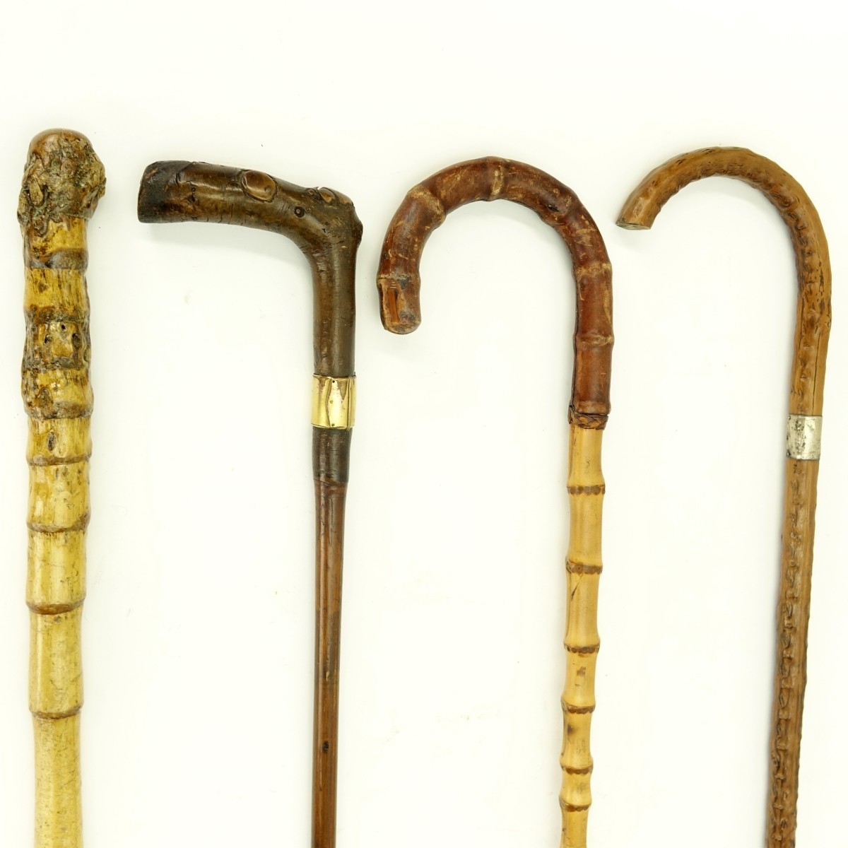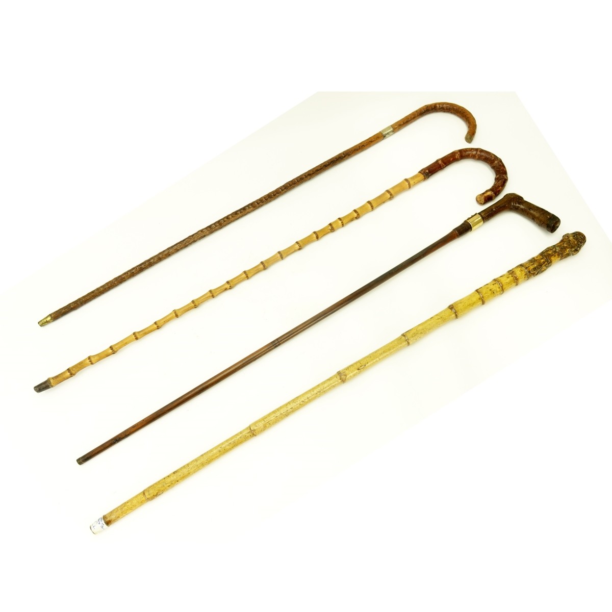 Four (4) Antique Canes. Wood and bamboo. Unsigned. Tallest measures 36" L. Condition: Overall good antique condition. Wear, rubbing. Estimate: $100.00 - $150.00 Domestic Shipping: Third party