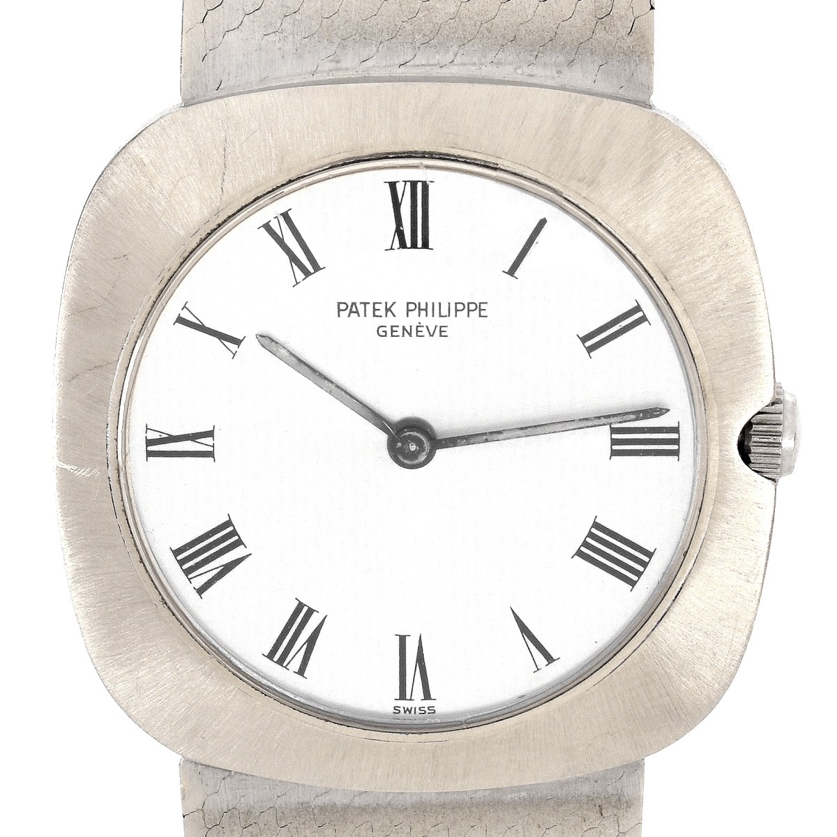 Man's Vintage Patek Philippe 18 Karat White Gold Manual Movement Bracelet Watch Ref. 3543-2 with Brushed Dial, Roman Numerals. Stamped 750 to clasp. Case measures 31mm x 31mm; bracelet measures 7" L. Approx. weight: 87.5 grams. Condition: Overall good vintage condition. Minor wear and scratches consistent with age and normal use. Running. Please note the gallery does not warranty the running condition of watches. No box, no papers. Estimate: $8000.00 - $10000.00 Domestic Shipping: $32.00