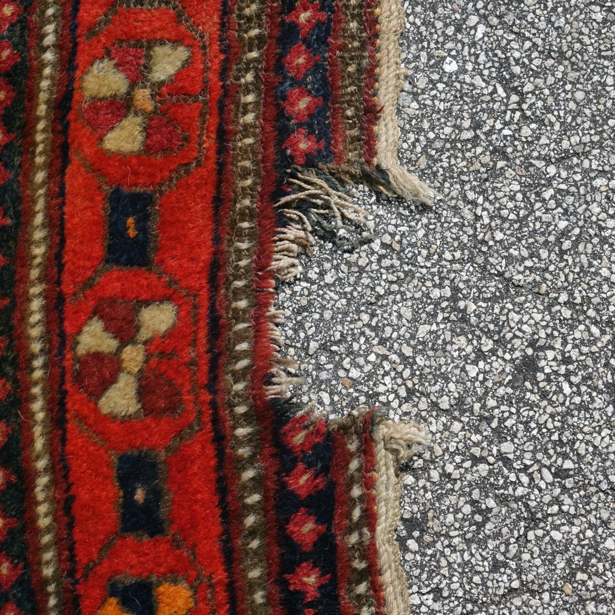 Semi Antique Middle Eastern Rug. Geometric patterns. Measures 97" x 54-1/2". Condition: Loss to fringes, has a loss to one corner, wear and stains, needs cleaning Estimate: $100.00 - $150.00 Domestic Shipping: Third party