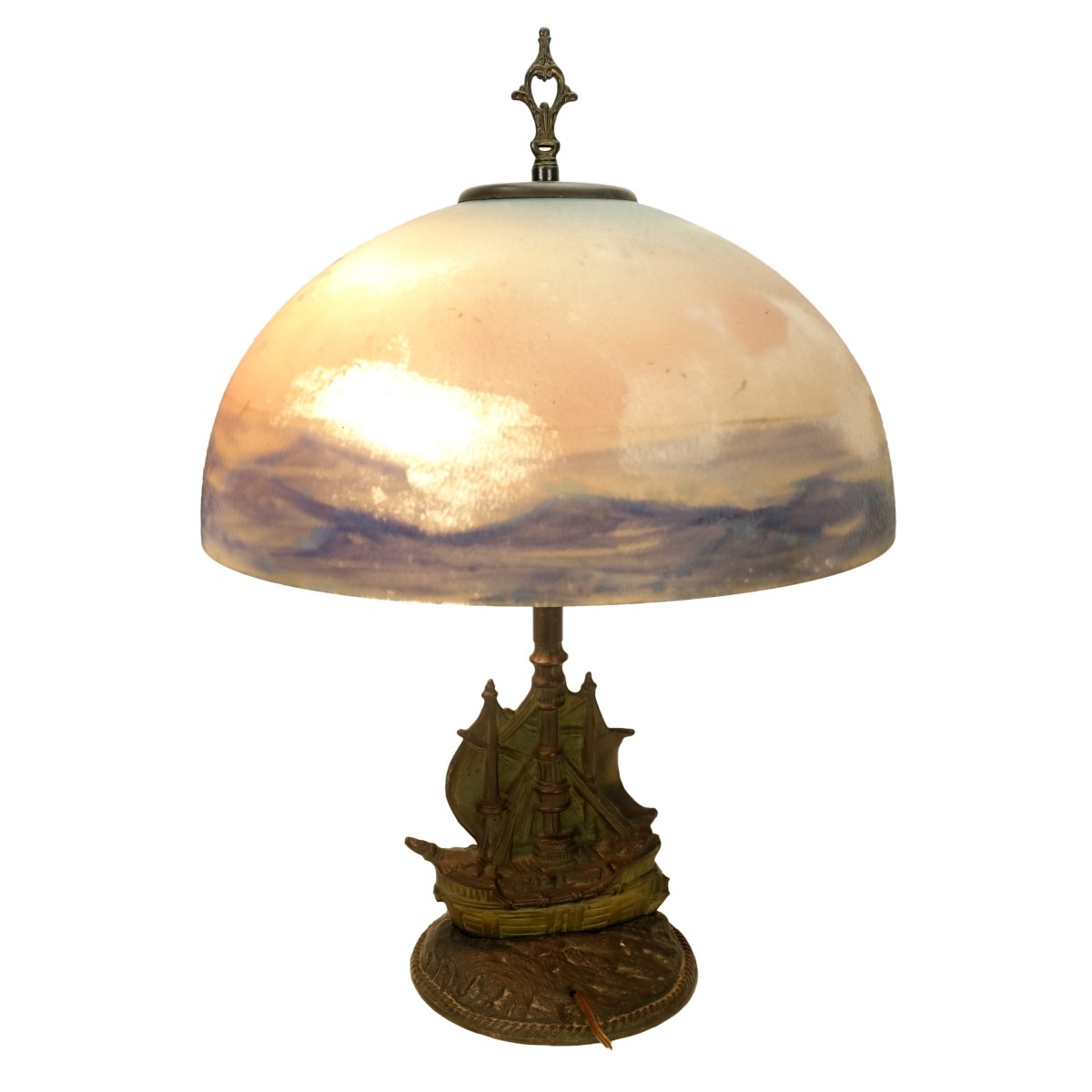 Antique Aladdin Reverse Painted Glass Nautical Lamp. The Shade reverse painted with a sailing ship motif, the base with a sailing ship form. Base signed. Measures 18-1/2 H, shade measures 7-3/8" H x 16" diameter. Condition: Typical wear from age and use. Estimate: $200.00 - $400.00 Domestic Shipping: Third party
