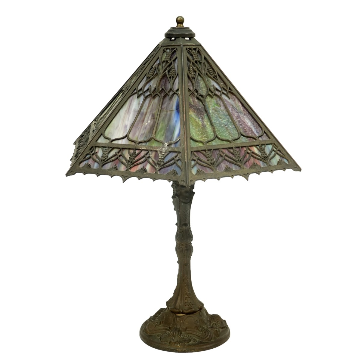 Antique H.A. Best & Company Murano Slag Glass Lamp. Signed on base, old Murano label on shade. Measures 21" H, Shade measures 9-1/4" H x 18-1/2" W. Condition: Cracks in glass, wear to finish. Estimate: $200.00 - $300.00 Domestic Shipping: Third party
