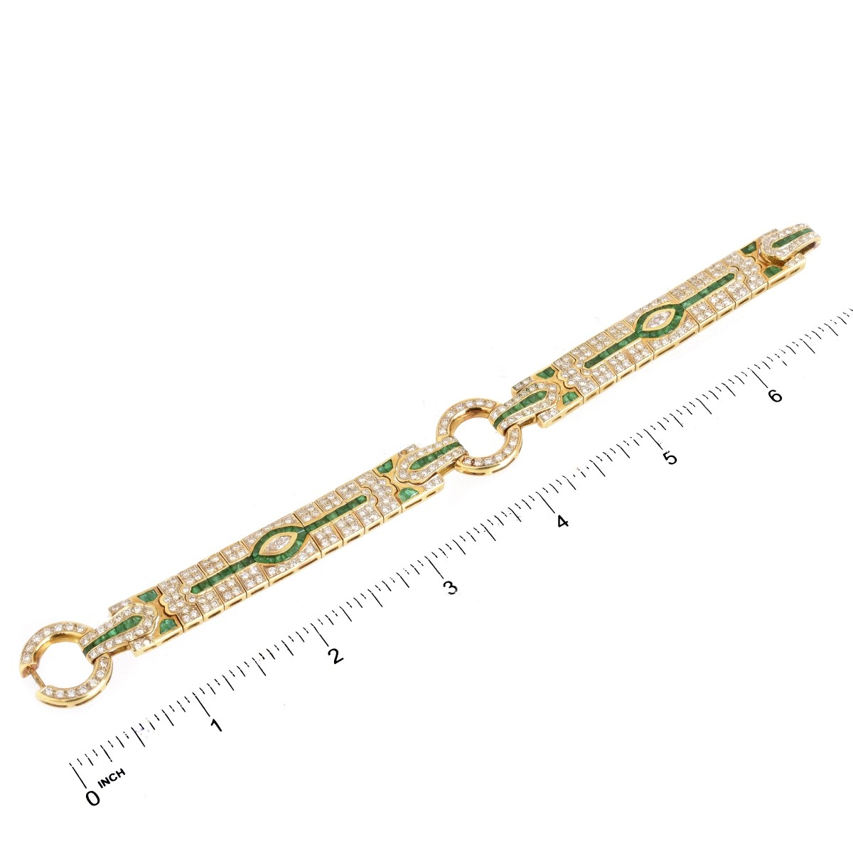 Approx. 4.0 Carat TW Pave Set Round Brilliant and Marquise Cut Diamond, 3.0 Carat TW Emerald and 18 Karat Yellow Gold Bracelet. Stamped 18K. Measures 7" L, 5/8" W. Approx. weight: 38.3 grams. Condition: Very good condition Estimate: $4500.00 - $6500.00 Domestic Shipping: $30.00