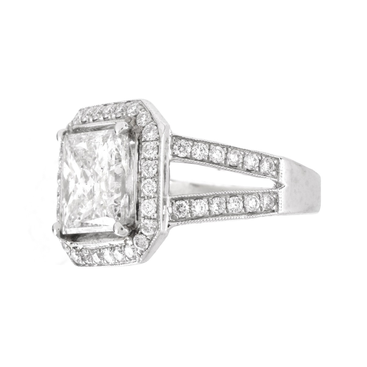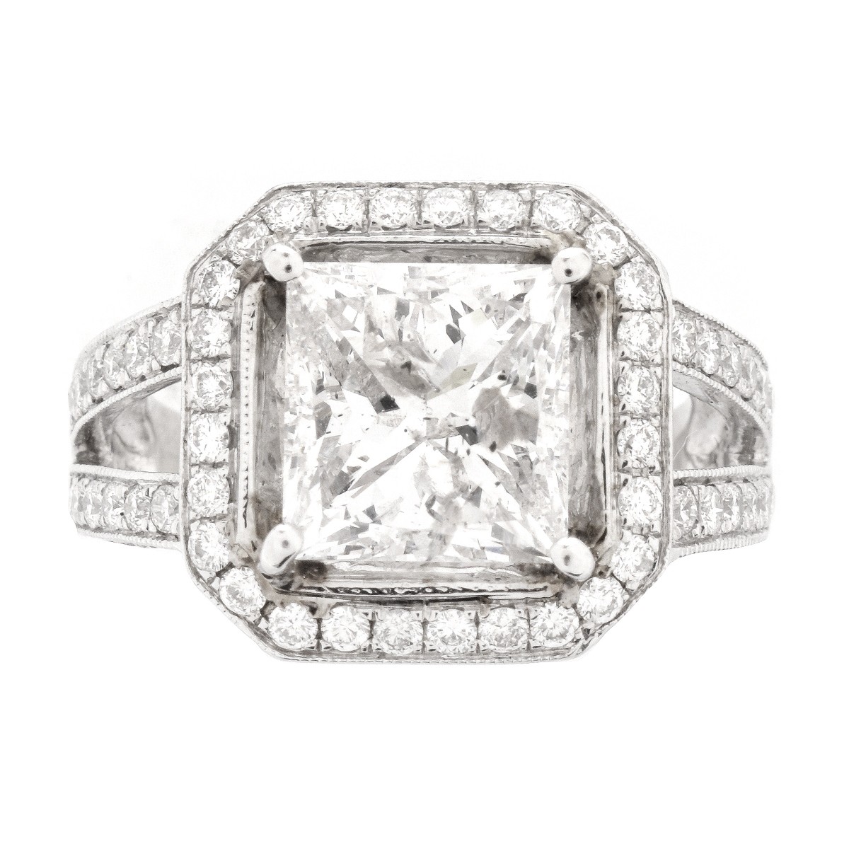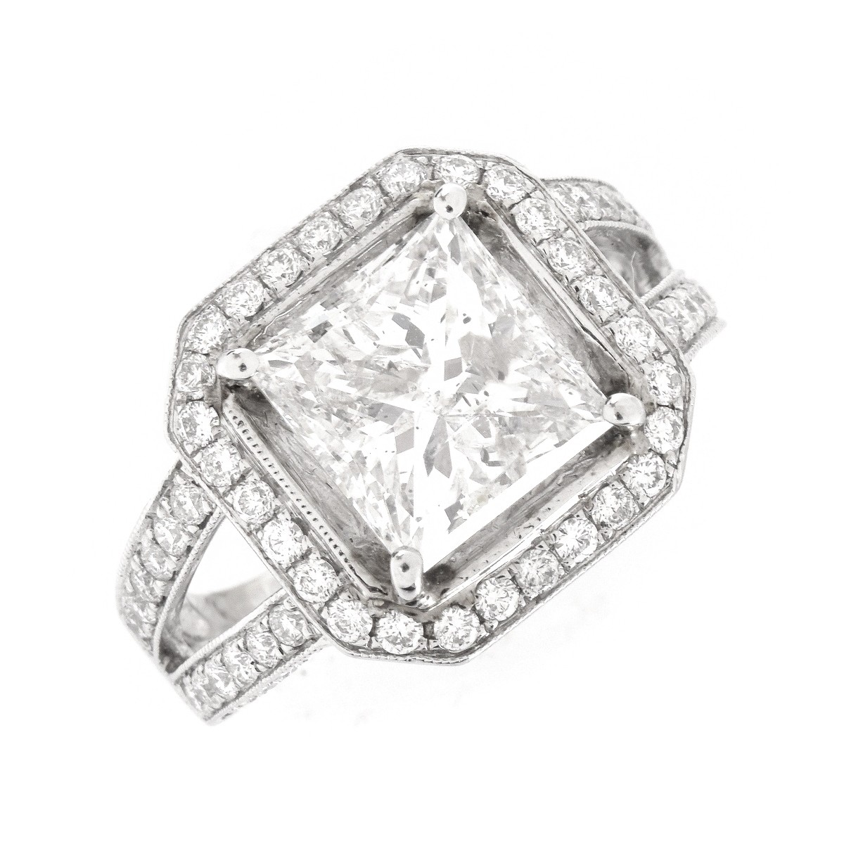 5.54 Carat TW Diamond and 14 Karat White Gold Engagement Ring. Set in the center with a 4.04 carat princess cut diamond, G color, SI2 clarity. Accented throughout with 1.50 carat round brilliant cut diamonds. Ring size 6-1/4. Approx. weight: 8.3 grams. Condition: Very good condition. Estimate: $18000.00 - $24000.00 Domestic Shipping: $28.00
