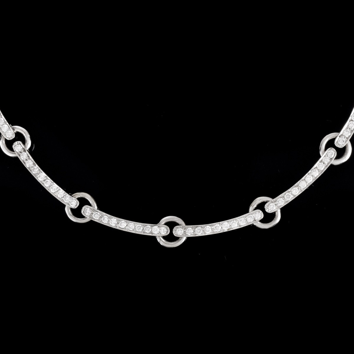 Approx. 2.50 Carat TW Round Brilliant Cut Diamond and 14 Karat White Gold Link Necklace. Stamped 14K. Measures 15 L, 1/4" W. Approx. weight: 33.8 grams. Condition: Very good condition. Estimate: $2500.00 - $3500.00 Domestic Shipping: $30.00