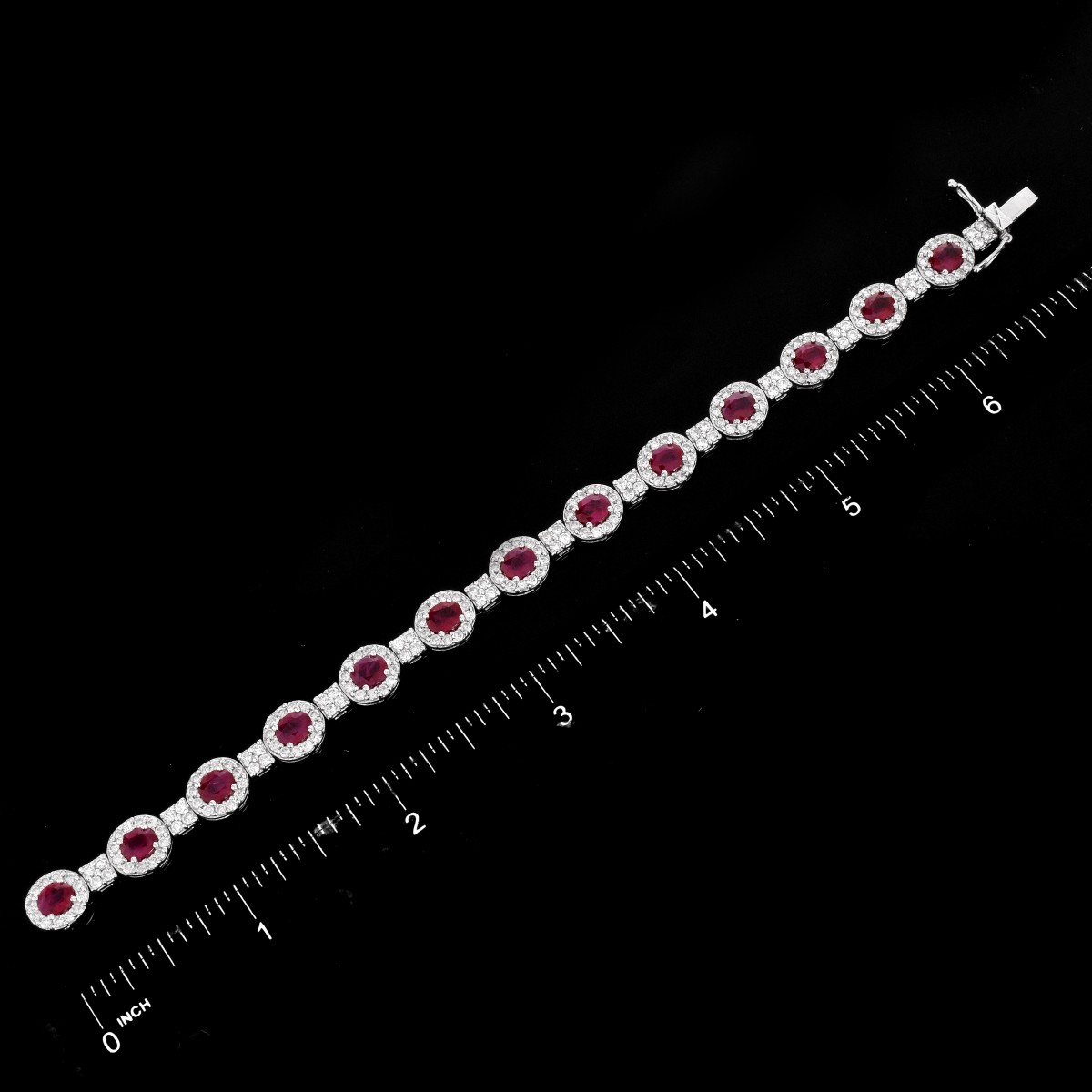 Approx. 13.0 Carat TW Oval Cut Ruby, 5.0 Carat Round Brilliant Cut Diamond and 18 Karat White Gold Bracelet. Stamped 750. Measures 6-5/8" L, 1/4" W. Approx. weight: 18.4 grams. Condition: Very good condition. Estimate: $4000.00 - $6000.00 Domestic Shipping: $30.00