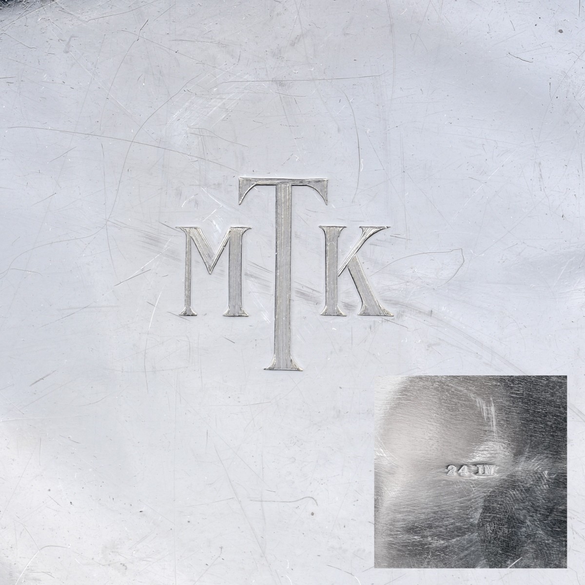Early 20th Century Tiffany & Co. Eight (8) Pieces Sterling Silver Tea/Coffee Set. Includes: Hot water kettle, coffee pot, tea pot, hot milk pitcher, cream pitcher, sugar bowl, waste bowl and tray. Bears monogram MTK. All pieces are signed. Tray measures 27-3/4" L x 18" W. Total approx weight of set 296.91 troy ounces. Condition: Good condition. Estimate: $10000.00 - $12000.00 Domestic Shipping: Third party