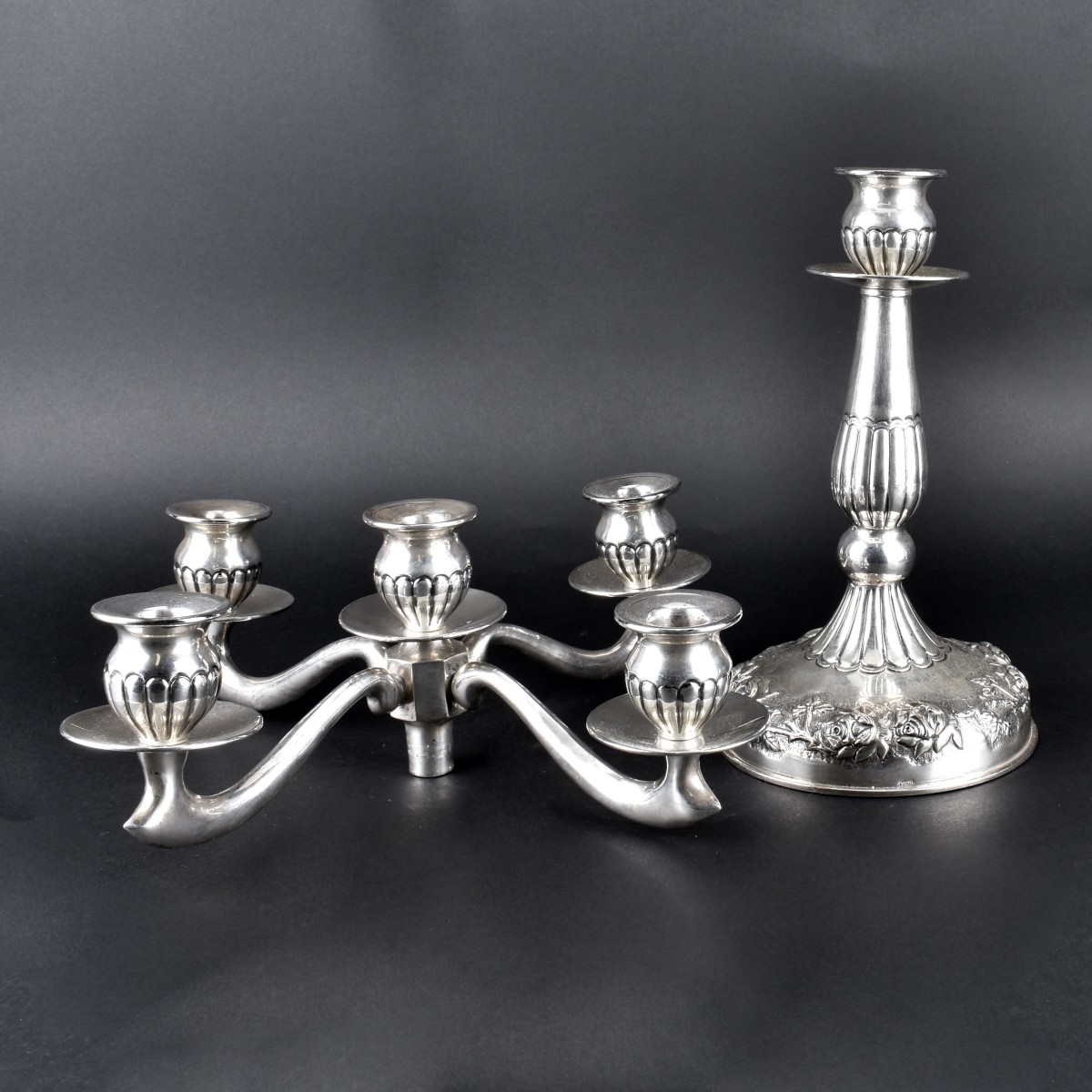 Antique Sterling Silver 5 Light Candelabra. Weighted. Stamped 925. Measures 14" H x 13-1/2" W. Weighs approx. 49.50 troy ounces. Condition: Good condition. Estimate: $300.00 - $500.00 Domestic Shipping: $95.00
