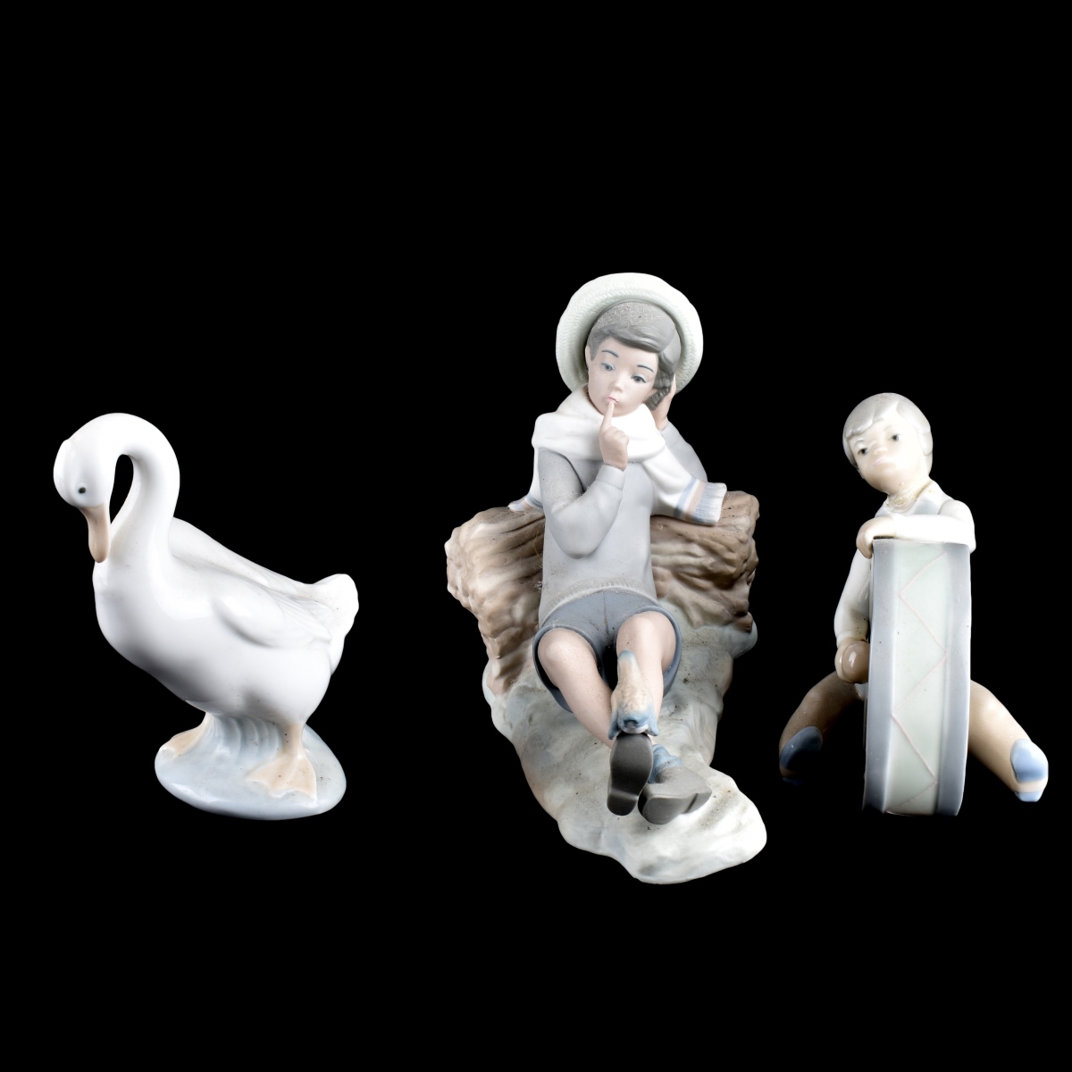 Grouping of Three (3) Lladro and Nau Porcelain Figurines. Includes: Nau Goose, Lladro Boy with Drum, and Lladro Pensive Young Boy. Each appropriately marked on bottom side. Largest measures 6" H x 8" L. smallest measures 4-1/2" H x 5" L. Condition: Drummer boy has a repair to neck otherwise good condition Estimate: $50.00 - $150.00 Domestic Shipping: $82.00