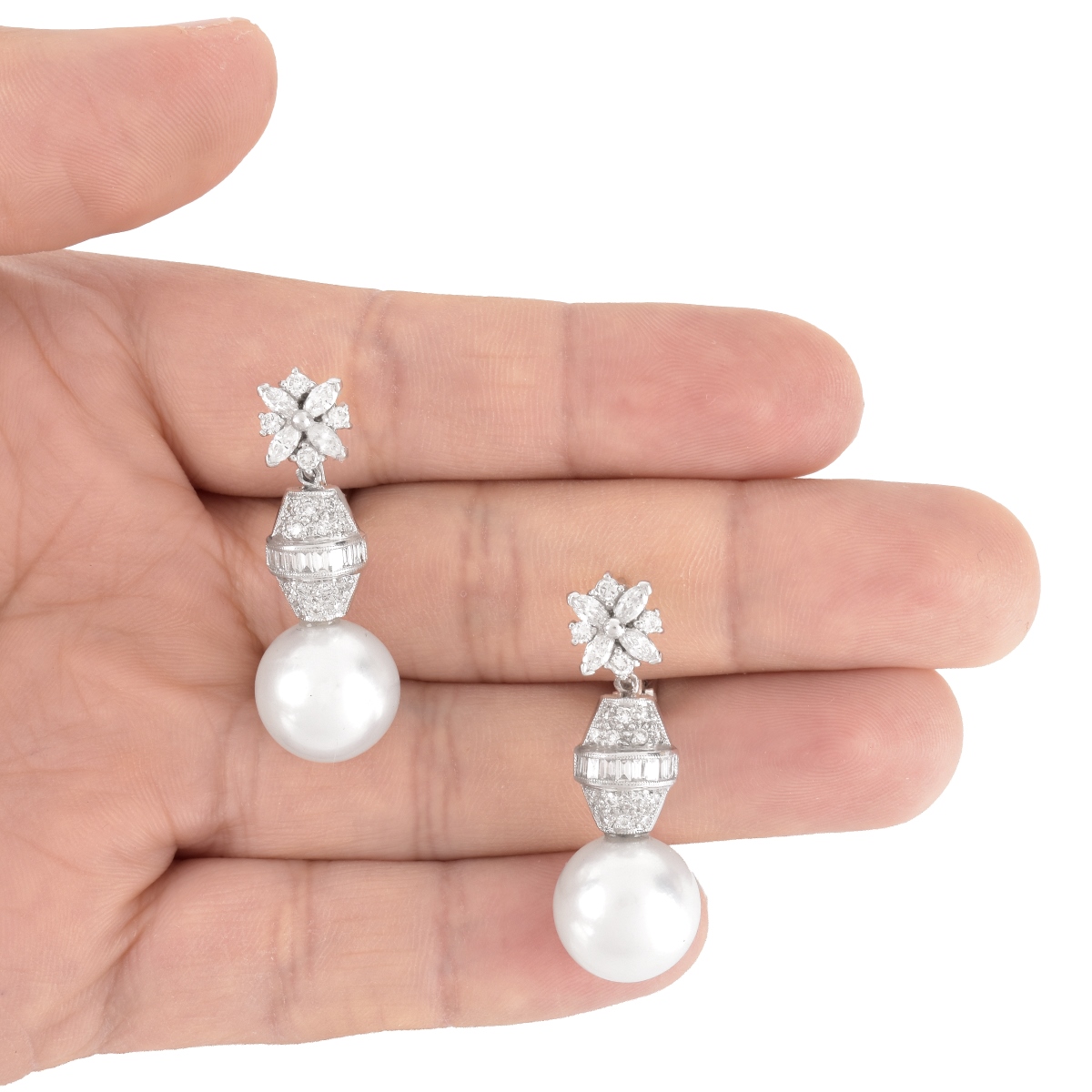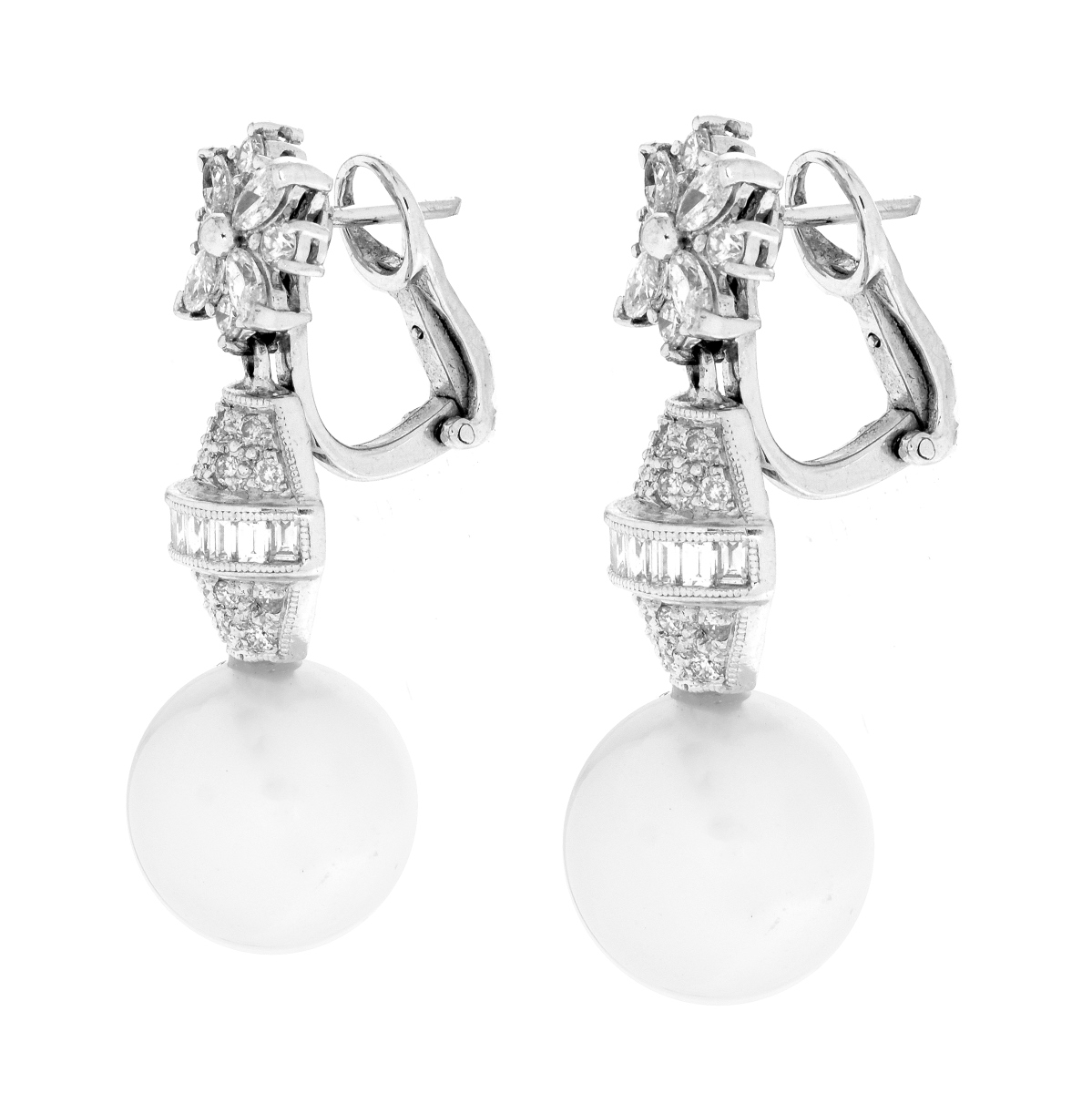 Approx. 1.65 Carat TW Marquise, Round Brilliant and Baguette Cut Diamond, 13.5mm South Sea Pearl, Platinum and 18 Karat White Gold Pendant Earrings. Measure 1-1/2" L, 1/2" W. Approx. weight: 18.9 grams. Condition: Very good condition. Estimate: $3000.00 - $4000.00 Domestic Shipping: $30.00