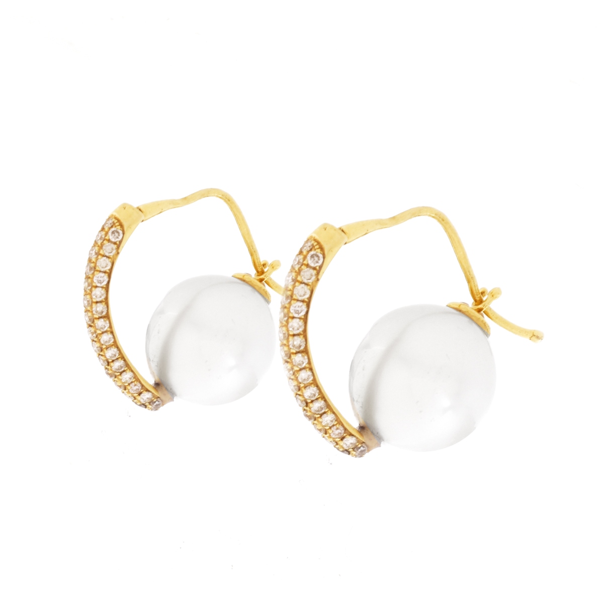 11.0mm White Pearl, .60 Carat Diamond and 14 Karat Yellow Gold Earrings. Measure 3/4" H, 3/8" W. Approx. weight: 5.9 grams. Condition: Very good condition Estimate: $800.00 - $1000.00 Domestic Shipping: $30.00
