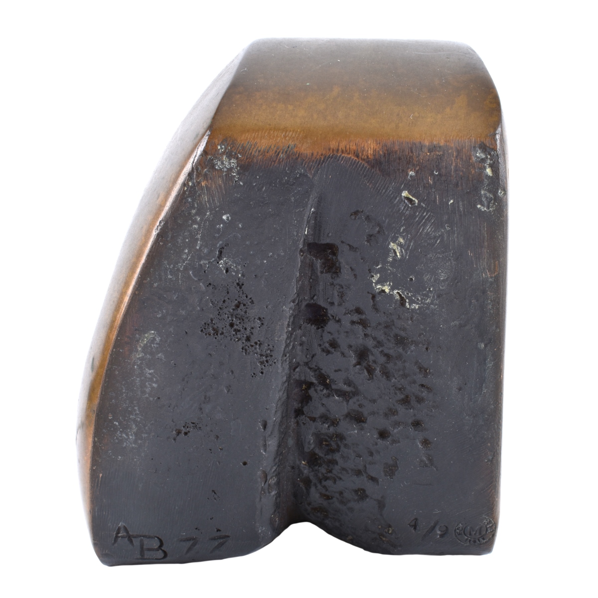 Aharon Bezalel, Israeli (1926-2012) Bronze sculpture. Abstract composition in three pieces. Initialed AB, dated '77 and numbered 4/9. M Foundry stamp. Measures 4-1/2" x5-3/4" x 3-1/2". Condition: Good condition. Estimate: $50.00 - $100.00 Domestic Shipping: $52.00