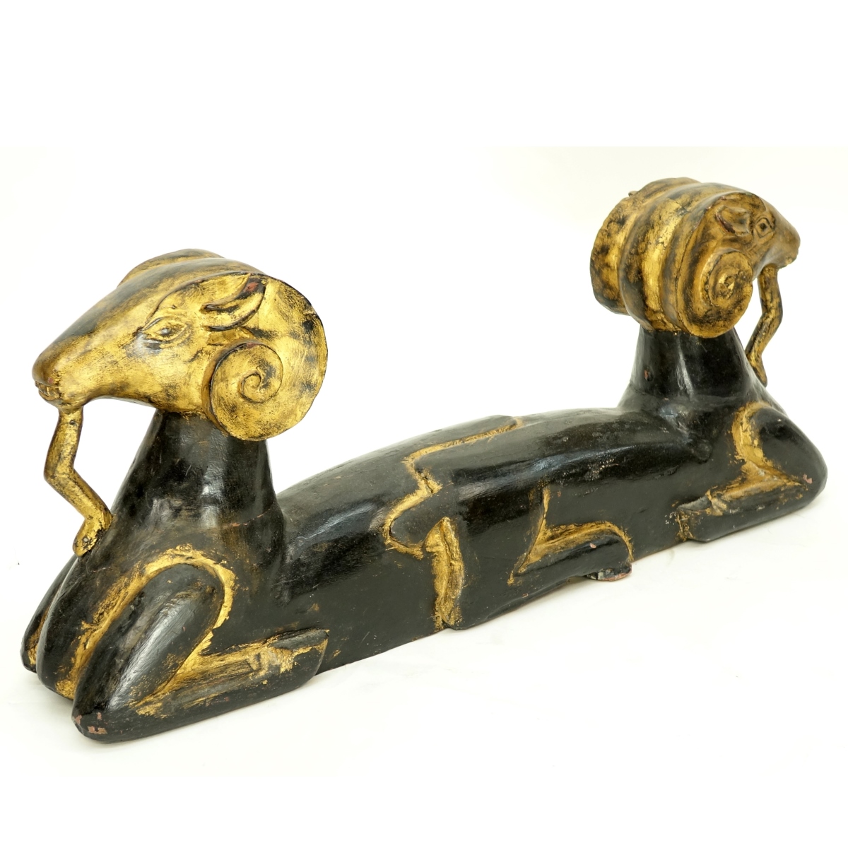 Large Oriental Polychrome Wood Carved Double Ram's Head Sculpture. Unmarked. Measures 16" H x 39" W x 7" D. Condition: Rubbing, typical wear to wood Estimate: $100.00 - $200.00 Domestic Shipping: Third party