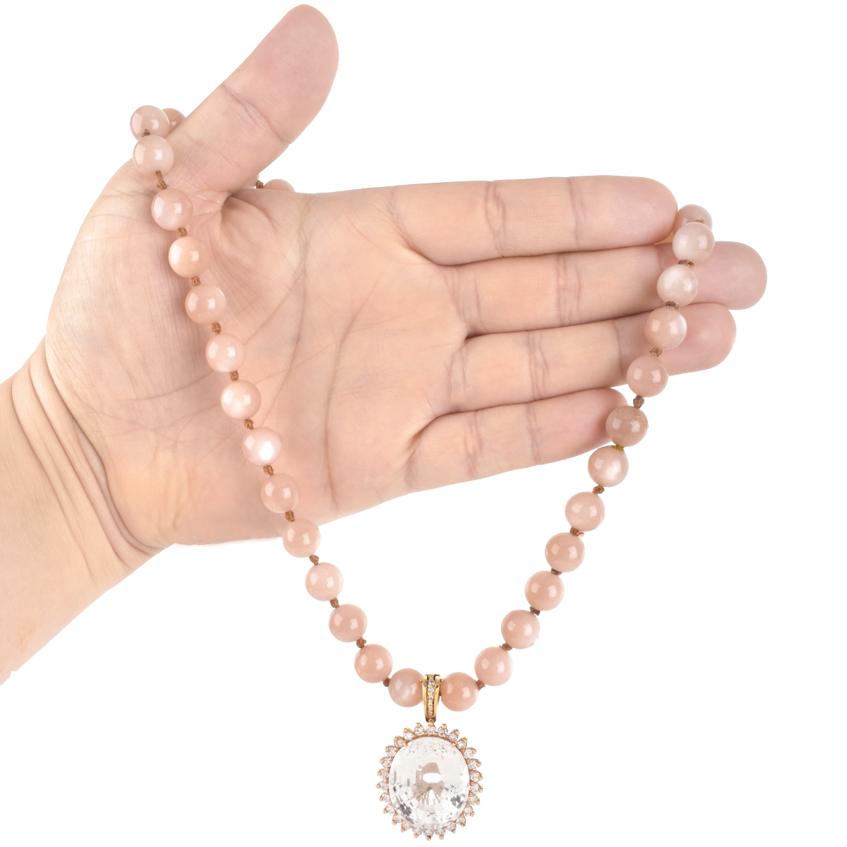 Approx. 48 Carat Oval Cushion Cut Topaz, 1.50 Carat Round Brilliant Cut Diamond, 10.0mm (possibly) Pink Moonstone Bead and 14 Karat Pink Gold Pendant Necklace. Pendant measures 1-1/2" L, 1" W; necklace measures 18" L.. Approx. weight: 74.4 grams. Condition: Very good condition. Beaded necklace requires the addition of a clasp. Estimate: $2500.00 - $3500.00 Domestic Shipping: $30.00