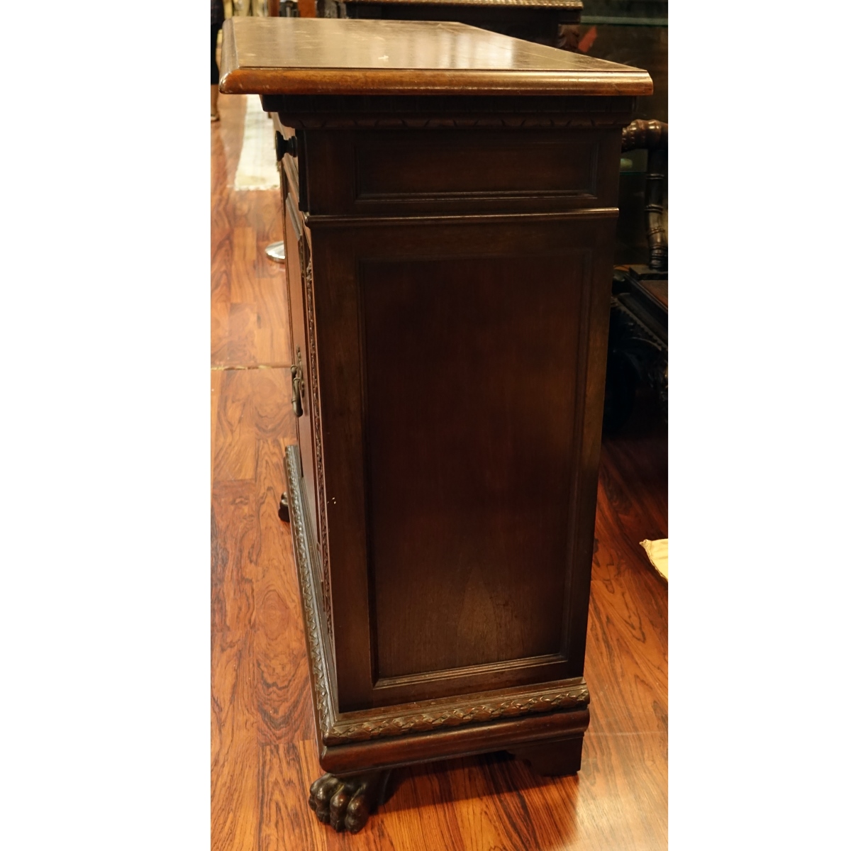 19th Century Renaissance Carved Walnut Cabinet. Highly carved details with iron pull, single drawer and door, key included. Measures 42" H x 42" W x 18" D. Provenance: from the John C. Lilly Research Institute for interspecies communication in Coconut Grove Florida. Condition: Scratches to top and wear associated with age Estimate: $50.00 - $150.00 Domestic Shipping: Third party