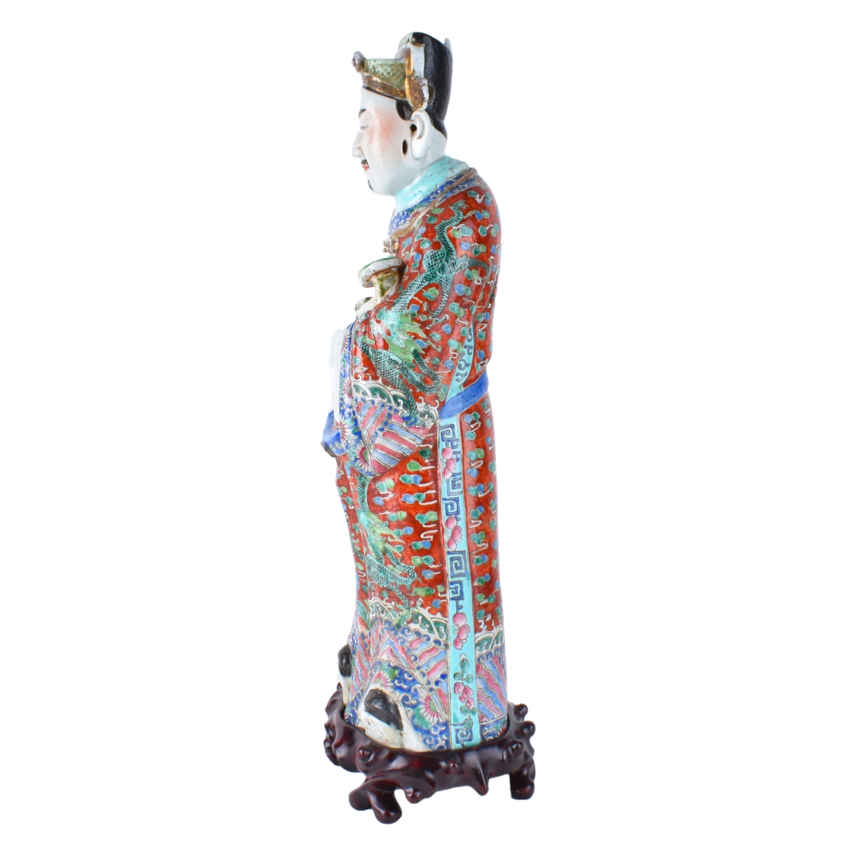 Large Chinese Famille Rose Export Porcelain Immortal with Scepter on Wooden Stand. Signed to base. Measures 18-1/2" H (figurine), stand measures 2" x 7". Condition: Wear consistent with age otherwise good condition Estimate: $300.00 - $400.00 Domestic Shipping: $115.00