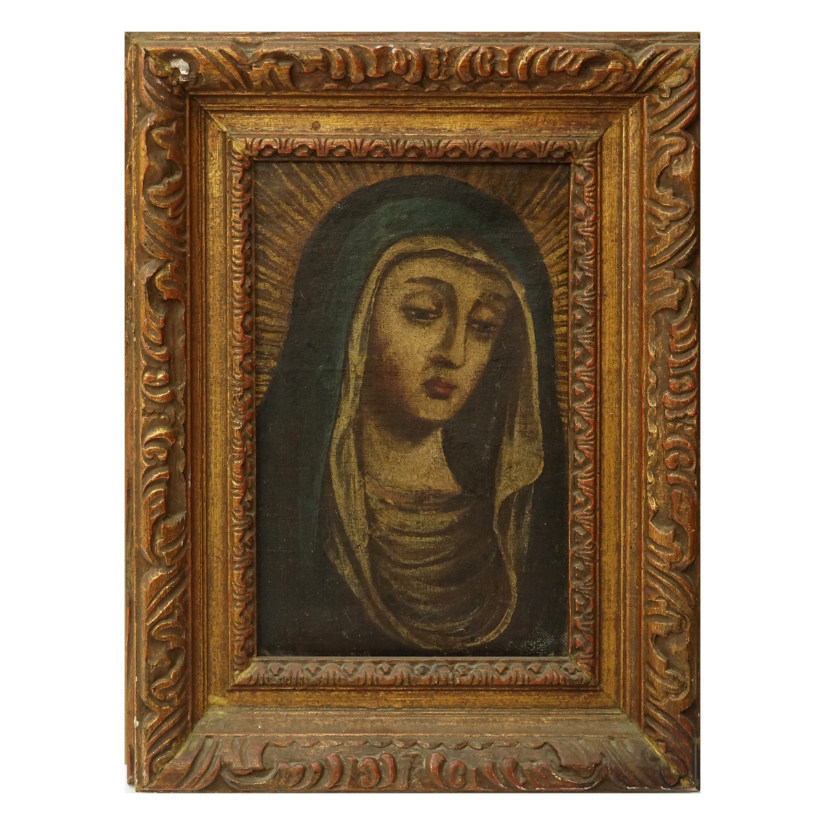 Cusco School Oil On Canvas "Madonna". Unsigned. Measures 15" x 10", frame measures 22-1/2" x 17". Condition: Craquelure, flaking. Estimate: $150.00 - $250.00 Domestic Shipping: $125.00