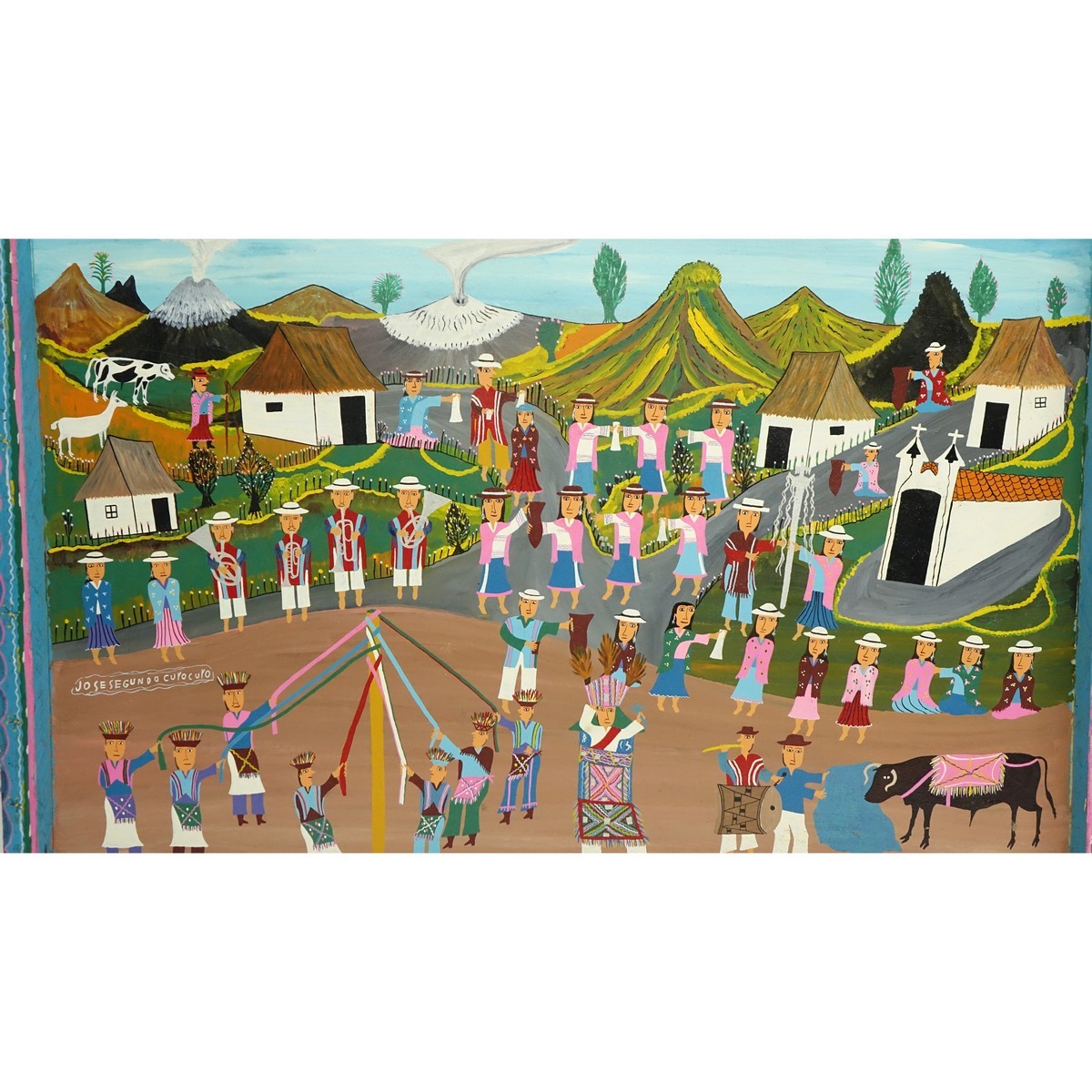 Jose Segundo, Ecuadorian (20th C) Acrylic on Skin, Village Scene,