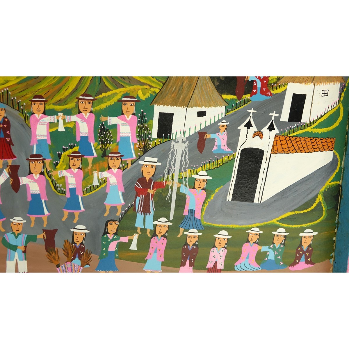 Jose Segundo, Ecuadorian (20th C) Acrylic on Skin, Village Scene, Signed Lower Left. Small tear top left corner or else good condition. Frame measures 25" H x 31-1/2" W. (estimate $100-$200) Shipping $165.00