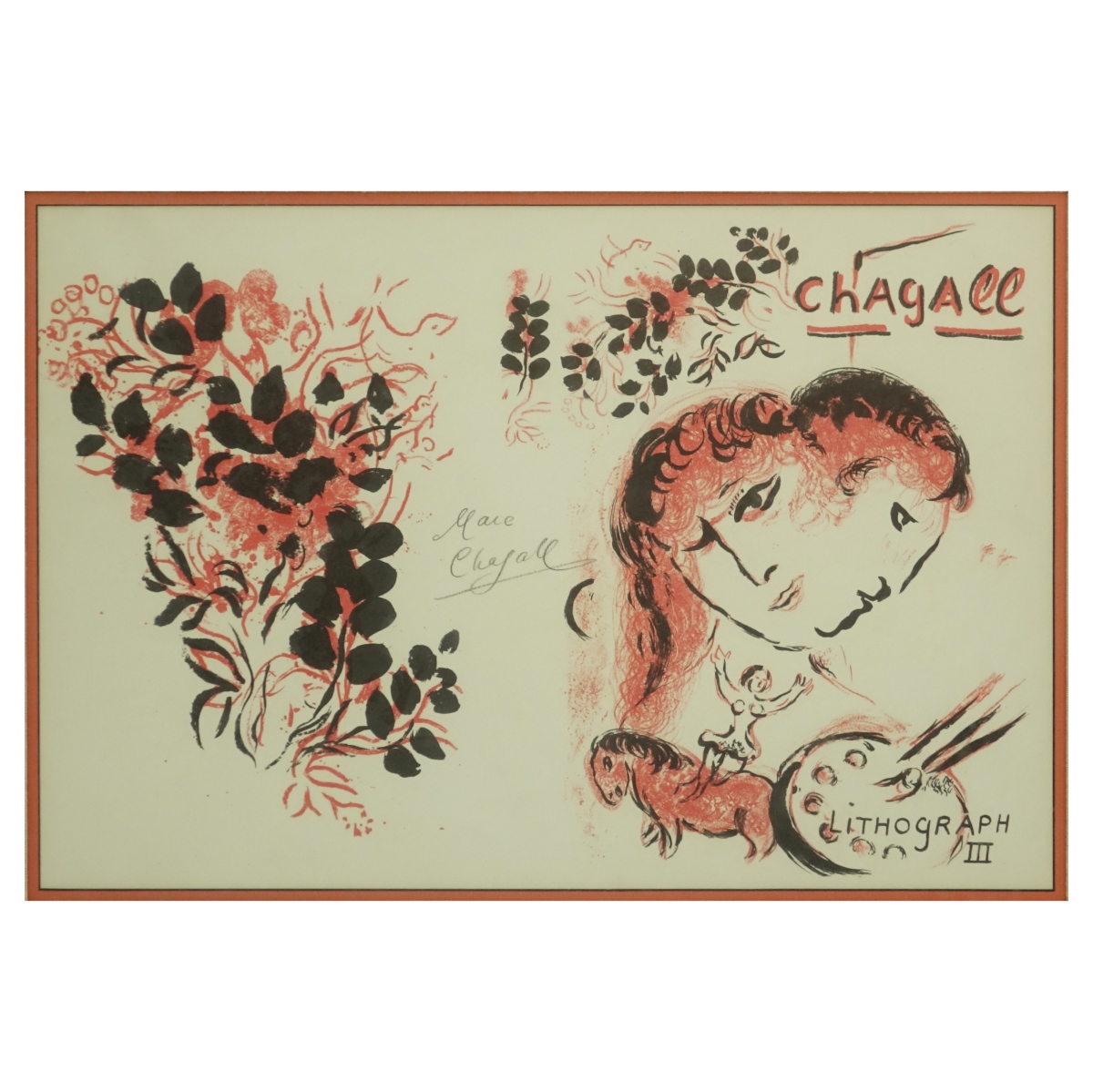 Marc Chagall, French/Russian (1887–1985) Color Lithograph "Lithographe III". Signed in crayon (graphite?) center. COA accompanies this lot. Measures 13" x 19-3/4", frame measures 27-1/2" x 33". Condition: Good condition. Estimate: $400.00 - $600.00 Domestic Shipping: Third party