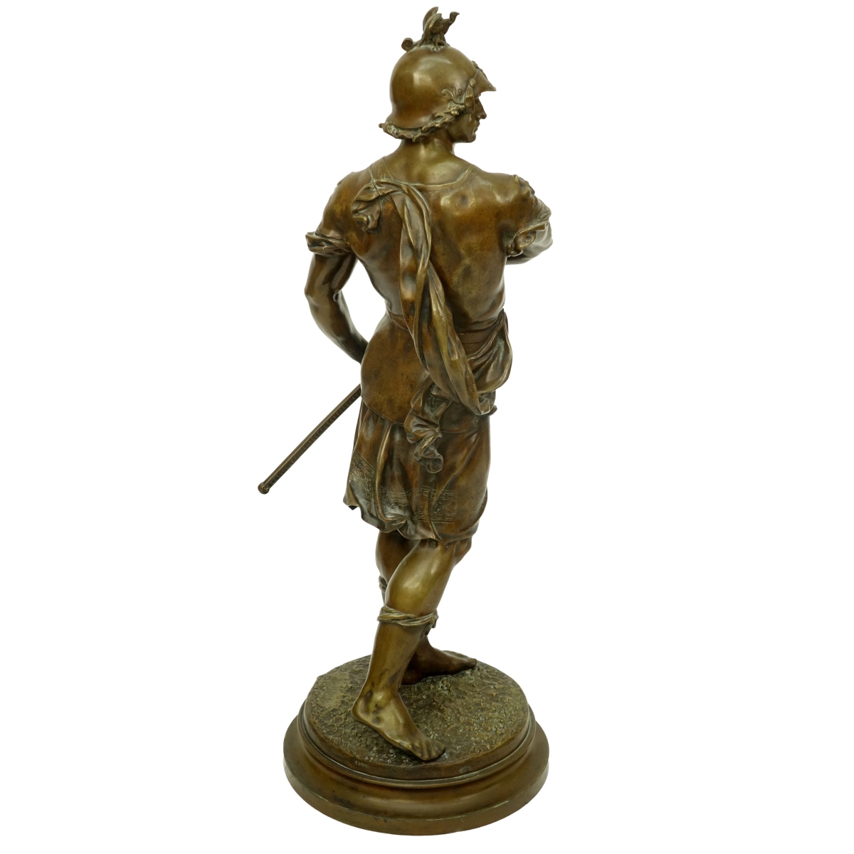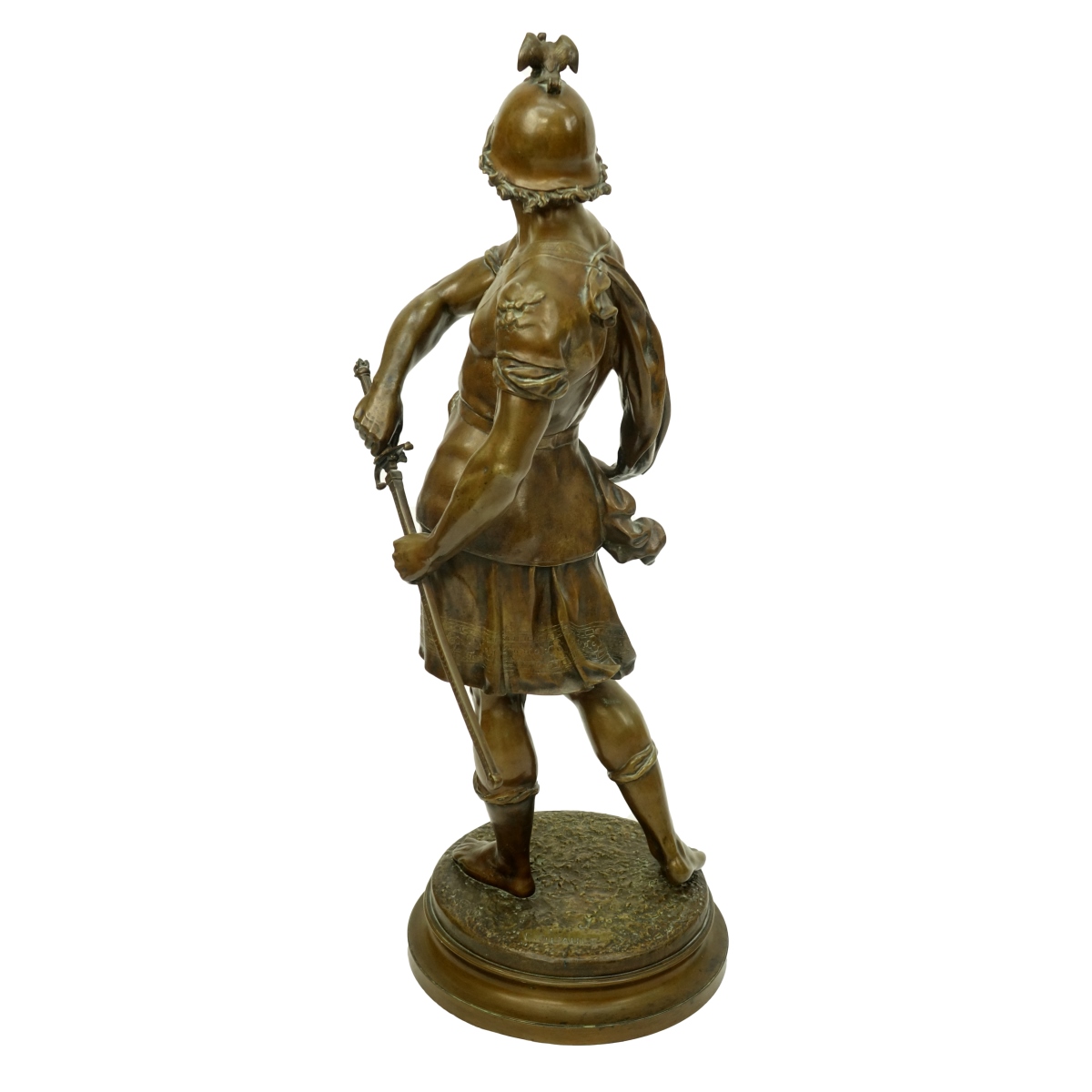 Emile Louis Picault, French (1833 - 1915) Bronze Sculpture "Bellum (War in Latin)" Signed "E. Picault" to Base. Measures 31-1/2" H x 12-1/2" W. Condition: Good condition Estimate: $2000.00 - $2500.00 Domestic Shipping: Third party