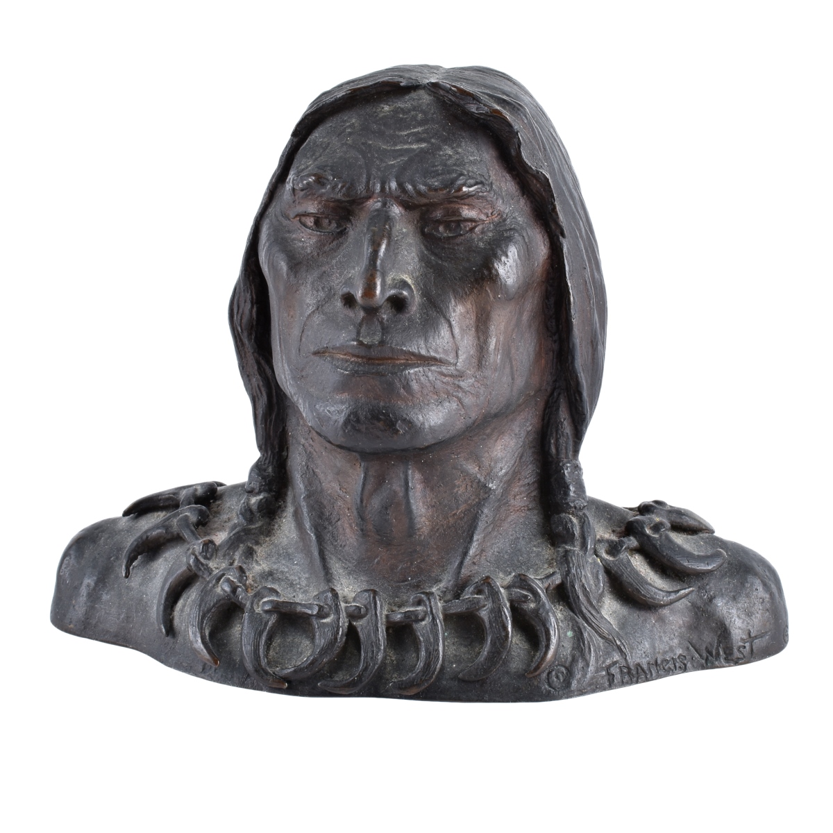 Francis West, American (1881 - 1971) Bronze Sculpture, Bust of an Indian Chief, Signed "Francis West" and Dated 1916 to Base. Measures 6" H x 8" W. Condition: Good condition Estimate: $200.00 - $300.00 Domestic Shipping: $58.00