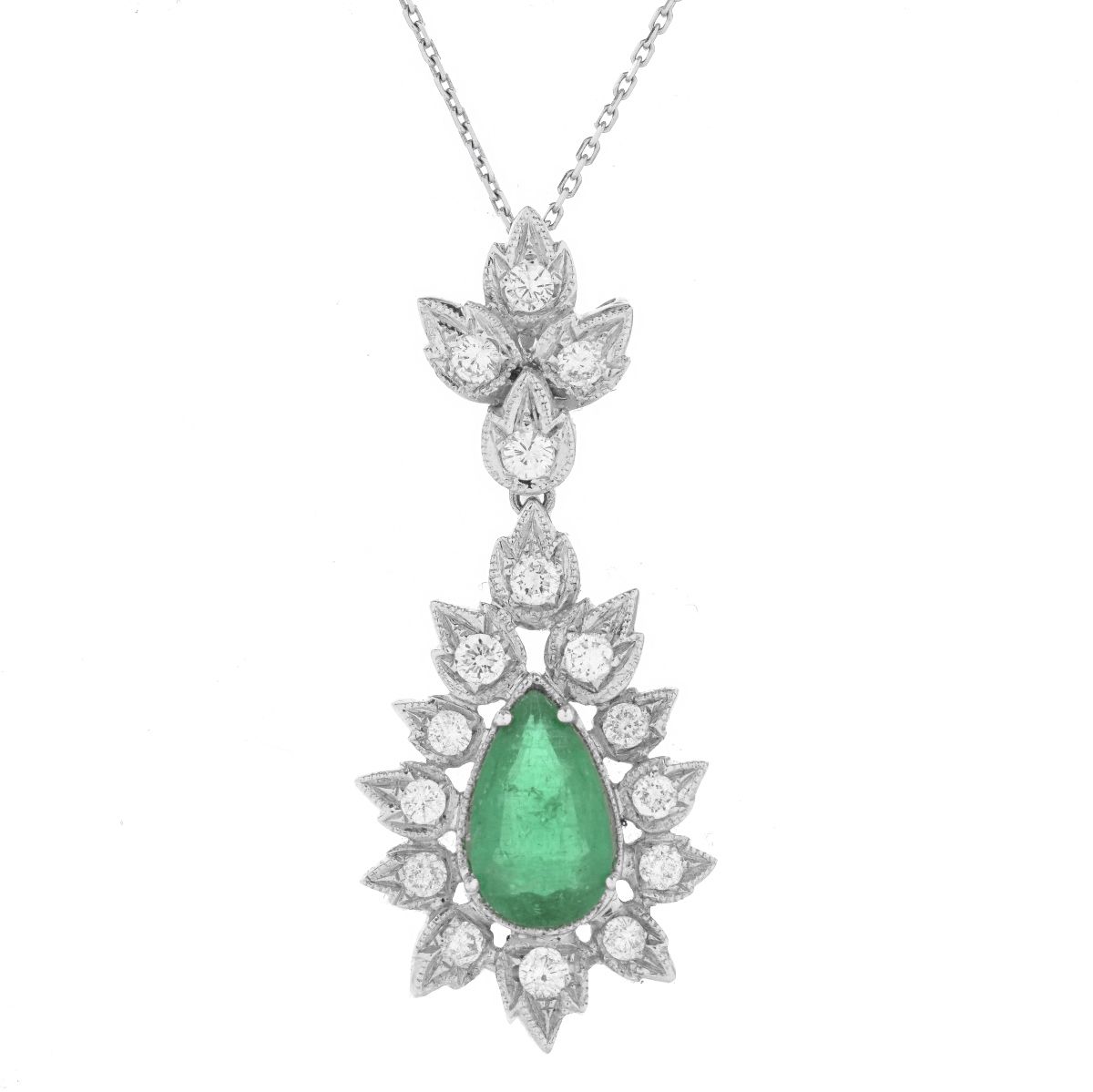 Approx. 1.85 Carat Pear Shape Emerald, .85 Carat Round Brilliant Cut Diamond and 18 Karat White Gold Pendant Necklace. Stamped 750. Pendant measures 1-5/8" L, 5/8" W; chain measures 16" L. Approx. weight: 6.7 grams. Condition: Very good condition. Estimate: $2500.00 - $3000.00 Domestic Shipping: $30.00