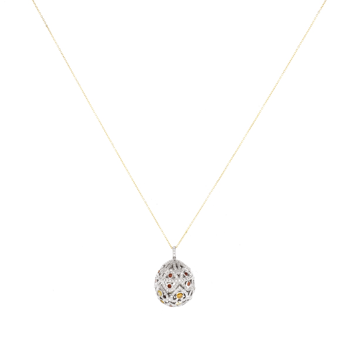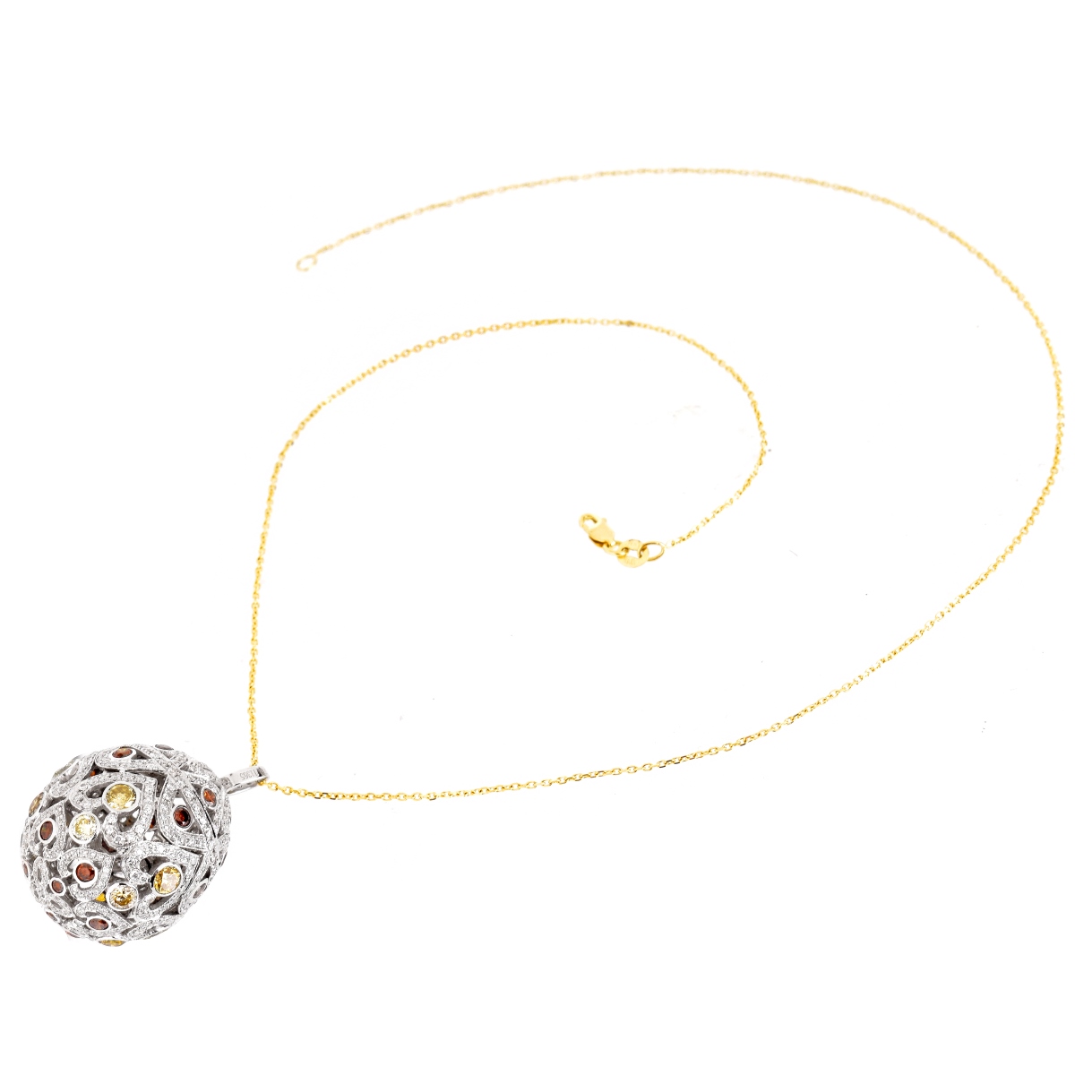 Italian Approx. 4.65 Carat TW Multi Color and White Round Brilliant Cut Diamond and 18 Karat White and Yellow Gold Ball Pendant Necklace. Stamped Italy 18K. Measures 18" L, pendant measure 1-1/8" H, 7/8" W. Approx. weight: 11.8 grams. Condition: Very good condition. Estimate: $3000.00 - $4000.00 Domestic Shipping: $30.00