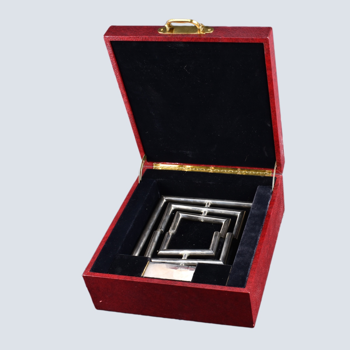 Yaacov Agam (b. 1928) Chrome Kinetic Sculpture "Space Divider". Original Box and instructions. Signed and numbered 92/150. Measures 8-1/2" x 7". Condition: The sculpture is a bit off kilter and does not completely flow freely. Estimate: $1500.00 - $2500.00 Domestic Shipping: $72.00